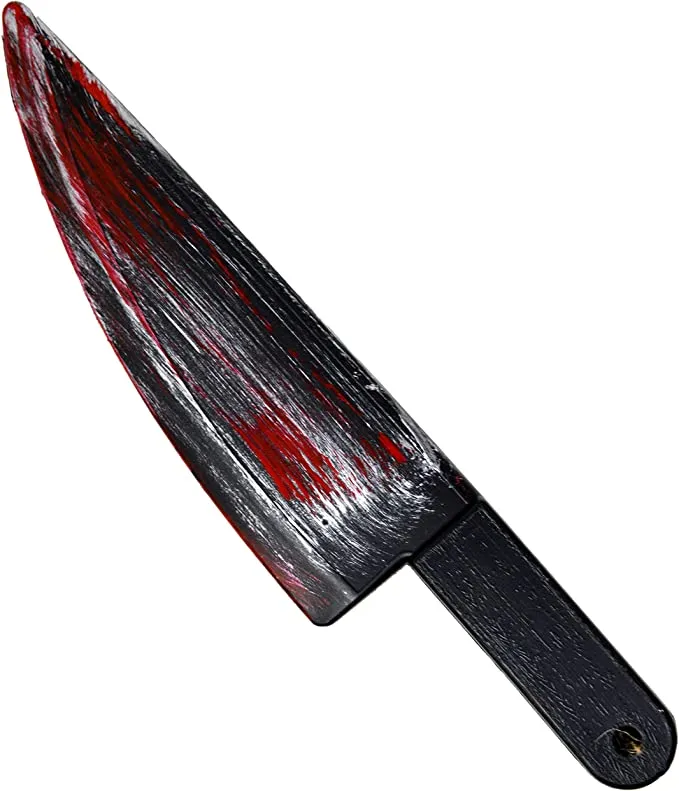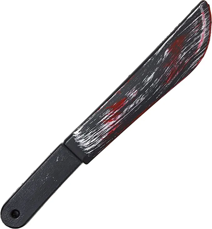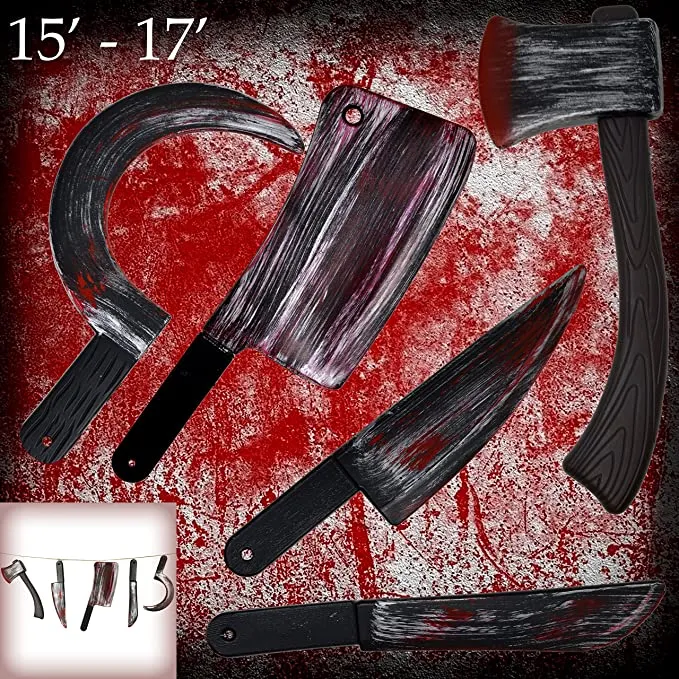 Halloween weapons include a fake bloody sickle, a machete, a knife, an axe, a cleaver, and a hook for easy hanging. Size for each: 15ββ17β². sturdy plastic of excellent caliber. premium set. Ideal for Halloween decorations, haunted houses, Halloween parties, hunter-themed events, costume dress-up accessories, hunter role-playing, zombie outfits, Chucky costumes, Michael Myers outfits, Alice Madness Returns cosplay, and more!