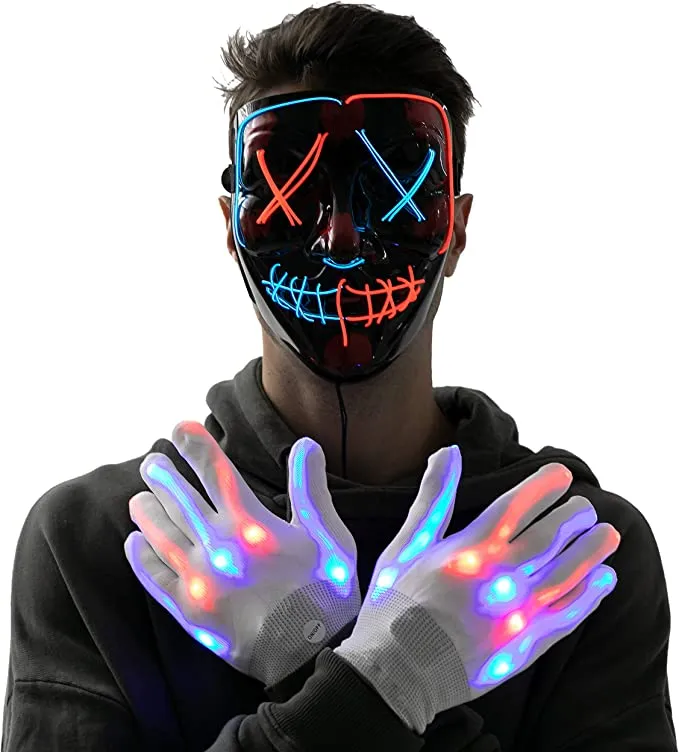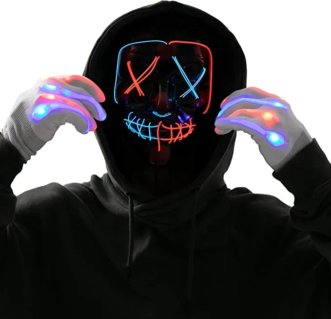 • Halloween Mask LED Light Up includes 1 Halloween Themed LED face Mask and a pair of gloves in blue and red color, making your Halloween party glow in the dark.