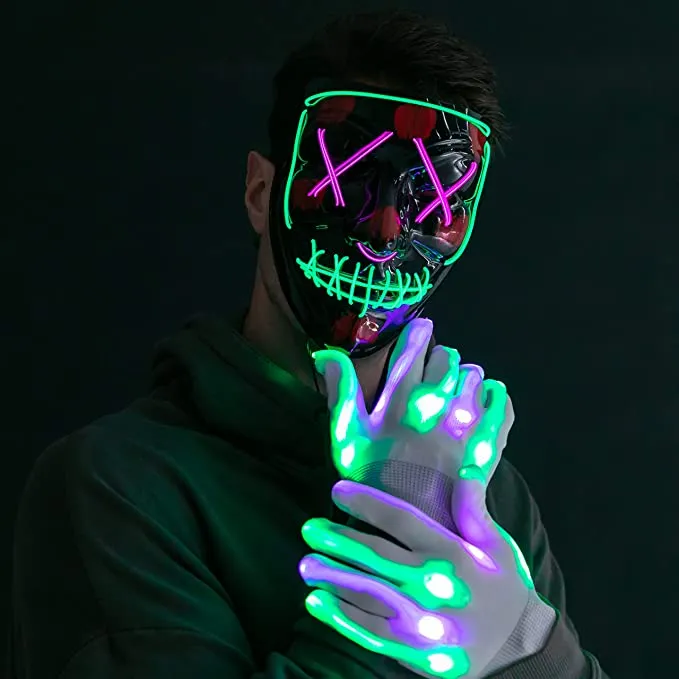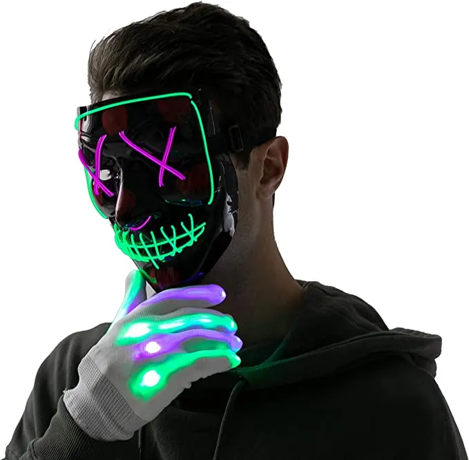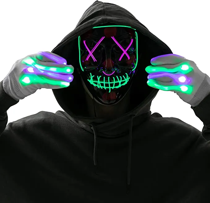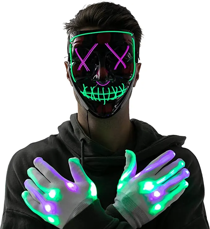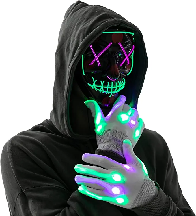 β’ LED Light Mask Halloween includes 1 Halloween Themed LED face Mask and a pair of gloves in green and purple color, making your Halloween party glow in the dark.