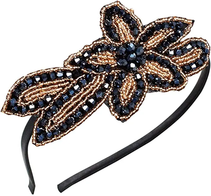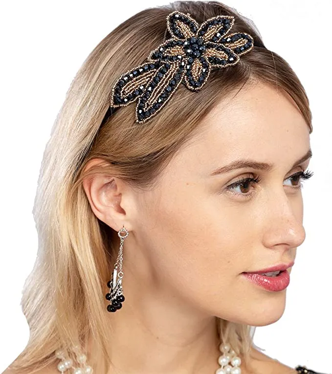 - Vintage Gatsby Elegant 1920s Accessories Set Includes Flapper Headband, Satin Gloves, Pearl Necklace, Chandelier Ear Rings, and Black Cigarette Holder.