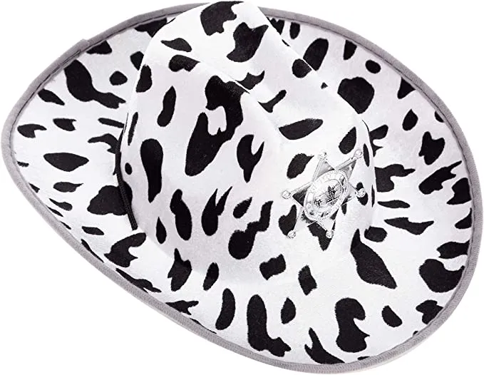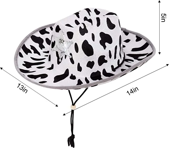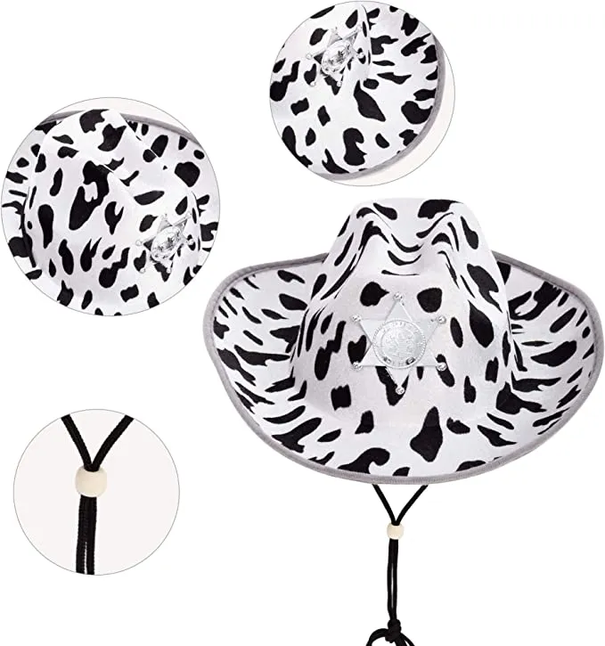 • Cowboy Hat Cow Print features a felt texture. This set comes with 2 cow print felt cowboy hats.