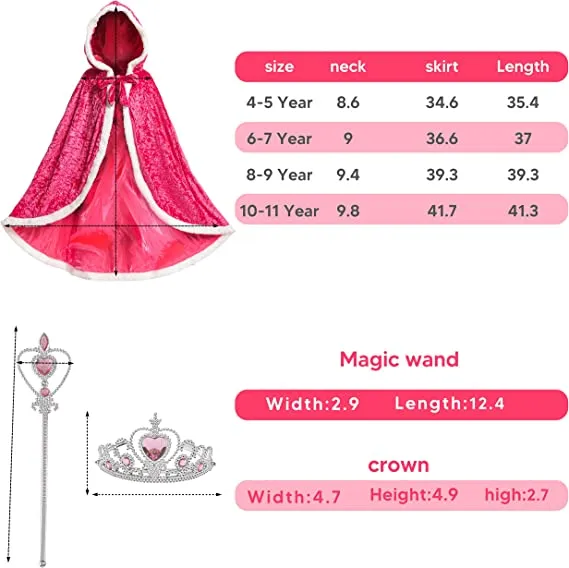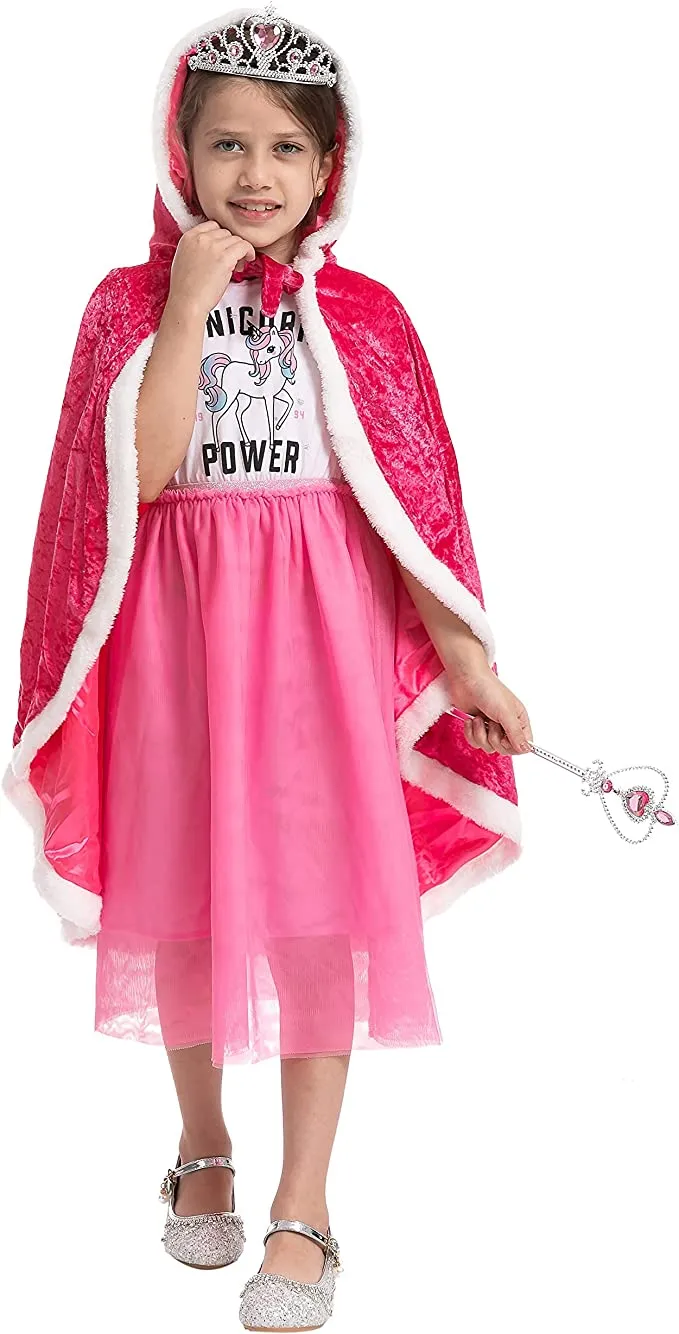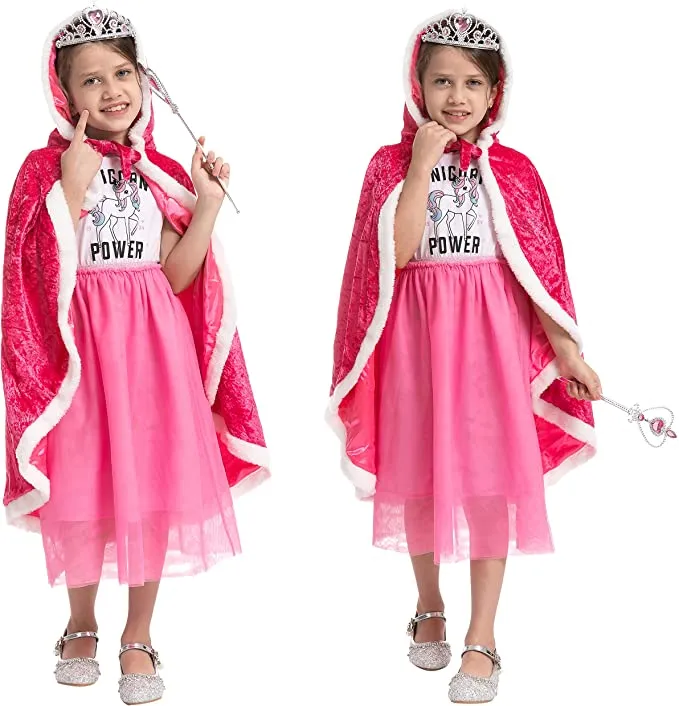 • Kid Princess Halloween Costumes feature one self-tie closure fluff cloak, one tiara/crown, and a magic wand. Every girl will realize her princess dream with our product.