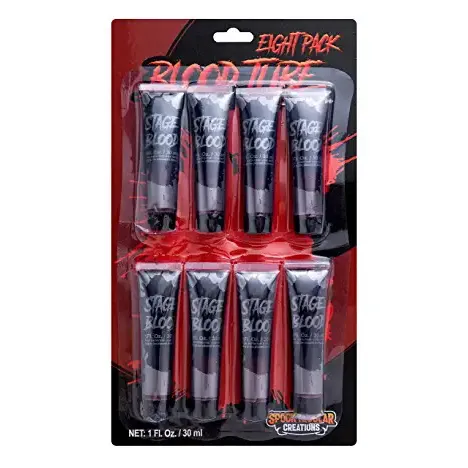β’ Halloween Fake Blood includes 8 Tubes 1 oz Fake Blood features an incredibly vibrant blood red color that looks and flows like the real thing. It is great for creating frightfully realistic special effects.