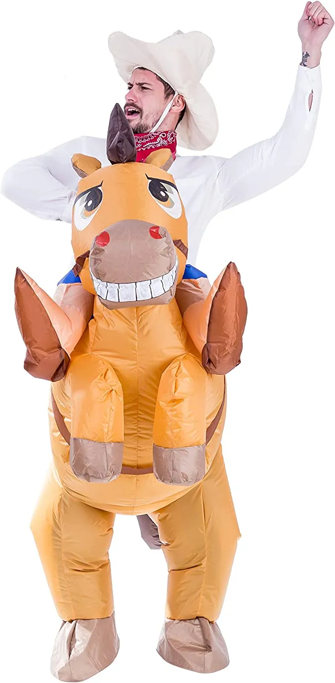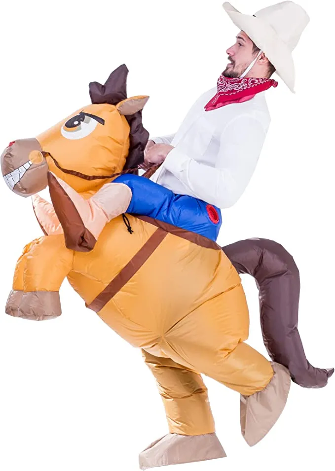 Make a grand entrance at your next Halloween party with this inflatable cowboy costume. This inflatable suit opens from the chest down, enabling easy access to put it on and take it off without any hassle. The battery pack is stored in the legs of the suit and should be placed in a pocket that is not located near your body as this may affect its temperature. Adjust the direction of the fan and tighten up drawstrings for the best inflating performance.