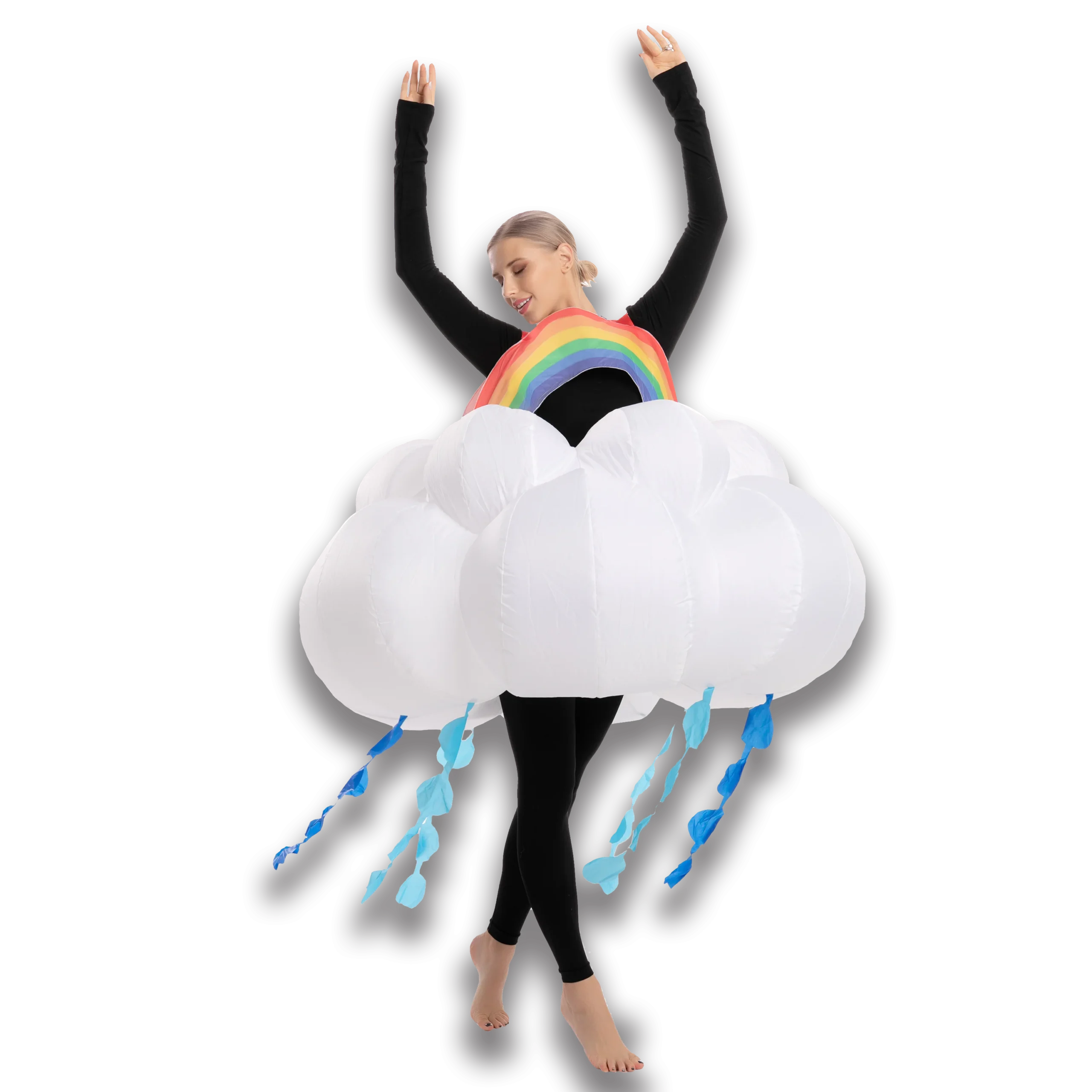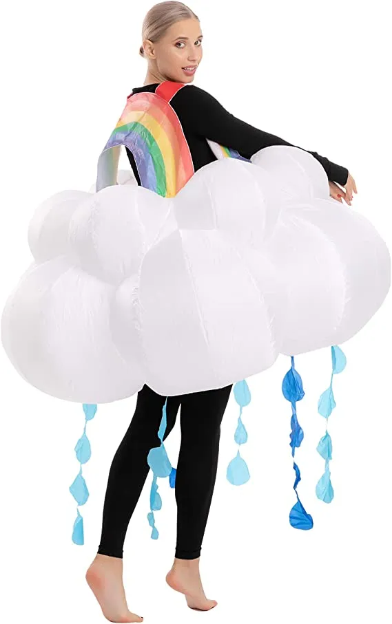 Our rainbow cloud costume is easy to use. You can put it on with our step-by-step instructions, or use your imagination and create some unique style for yourself. Wear this costume as a part of your cosplay outfit, or even just as comfortable lazy day clothing. Get ready for big air time in this colorful costume! Perfect for Halloween dress-ups, costume parties, and events held on Halloween night. If a battery pack needs to be stored securely, place it inside the costumeβs leg pockets rather than in your own pocket, as doing so risks the battery pack overheating. Adjust the direction of the fan and tighten drawstrings for the best inflatable performance.