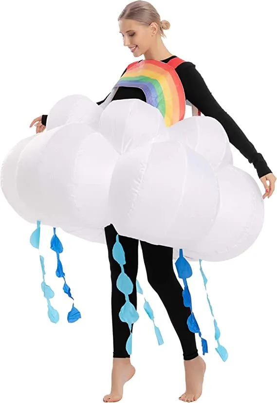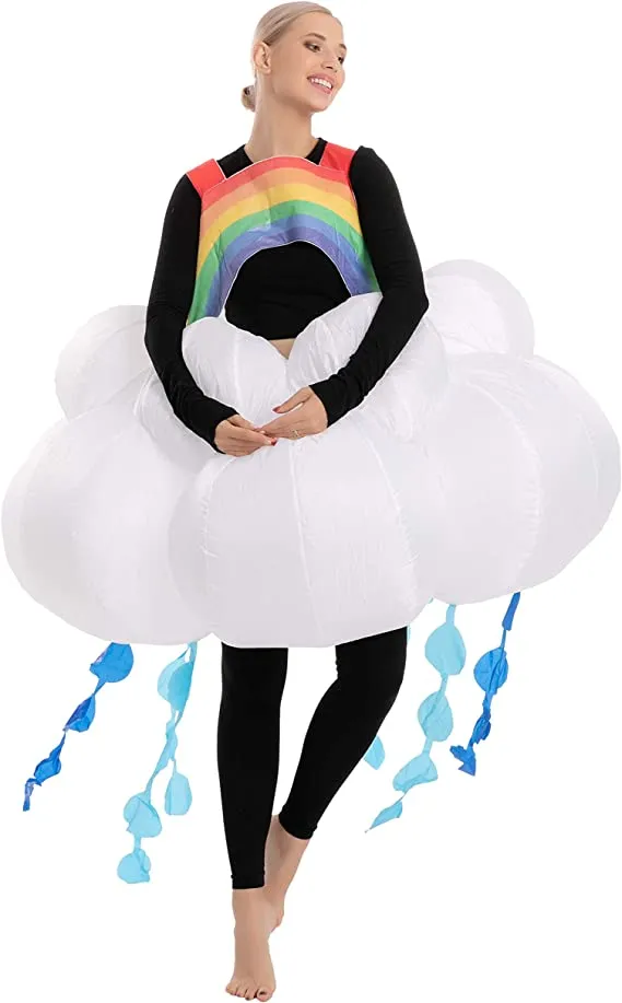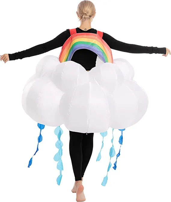Get the rainbow cloud costume that can give you the enchanting appearance of a fairy or an angel. Wear it as a dress at your special party and create amazing memories to cherish. The best part is that thereβs no need for any sewing, ironing, or hot gluing. All you have to do is inflate with air, turn on the fan, and zip it up for the fit that works for you! Have sunshine on a cloudy day when you wear this costume! The outfit resembles a sizable skirt that is fastened to an upside-down U-shaped halter that is striped in a rainbow of colors.