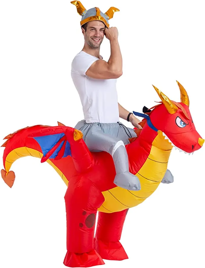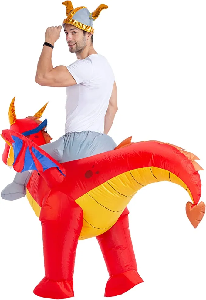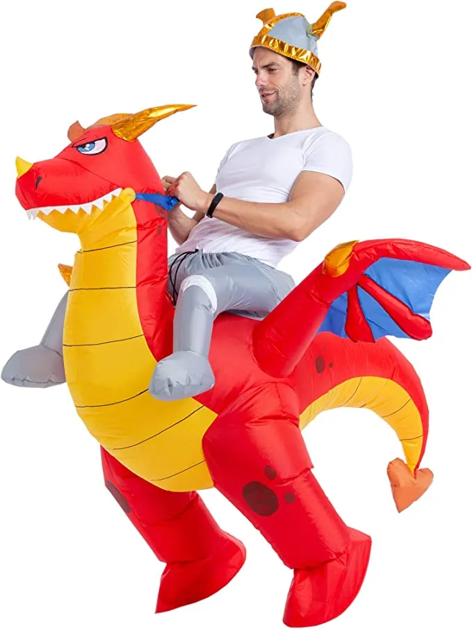 Fly high and inspire legends in this inflatable dragon costume! Don’t like to cover up your face but still want something looks fun? I have to tell you that your ideal fit will be this inflatable ride-on dragon costume! Pull the drawstring waistband tight across your belly as you step into the costume as though putting on a pair of jeans. The back of the inflatable costumes has a battery-powered fan installed on it. When the costume is fully inflated, it looks like a fierce two-legged dragon with wide wings and a curled tail. At the costume contest this year, this inflatable dragon rider outfit will burn your competitors! Spend your Halloween riding this fierce dragon to bring you above the clouds TODAY!