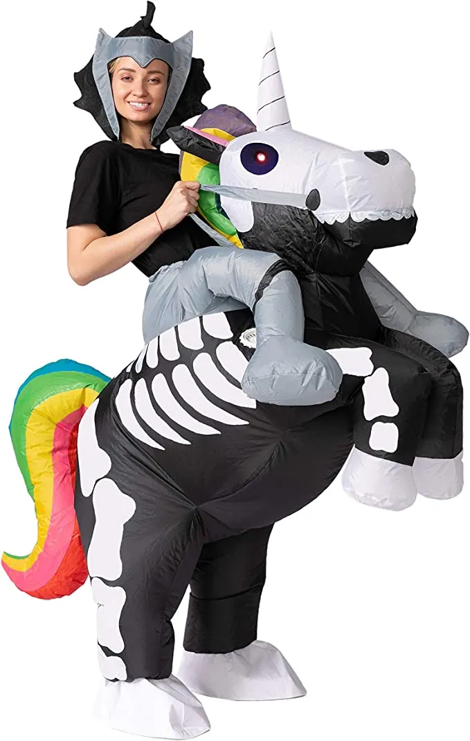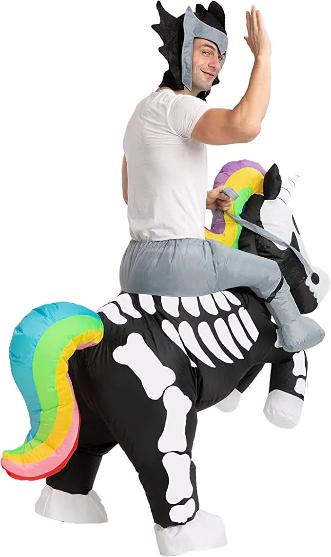 Halloween is nothing if not fabulous. That’s why this skeleton unicorn inflatable is basically the best possible inflatable this year. In a year filled with bleak clouds and sadness, a grinning unicorn with a rainbow mane and tail and oddly glowing eyes are just what the gods of Halloween ordered. It’s so absurd that you can’t look at it without giggling. Pull your feet through the connected foot coverings and back legs of the costume to mount the unicorn. False legs linked to the unicorn’s back tie around your waist to make it appear as though you are riding the galloping steed, and elastic cuffs around the ankles assist keep the outfit in place. The felt helmet that comes with it completes your readiness to safely face the dragon population of Mak B’Leev!