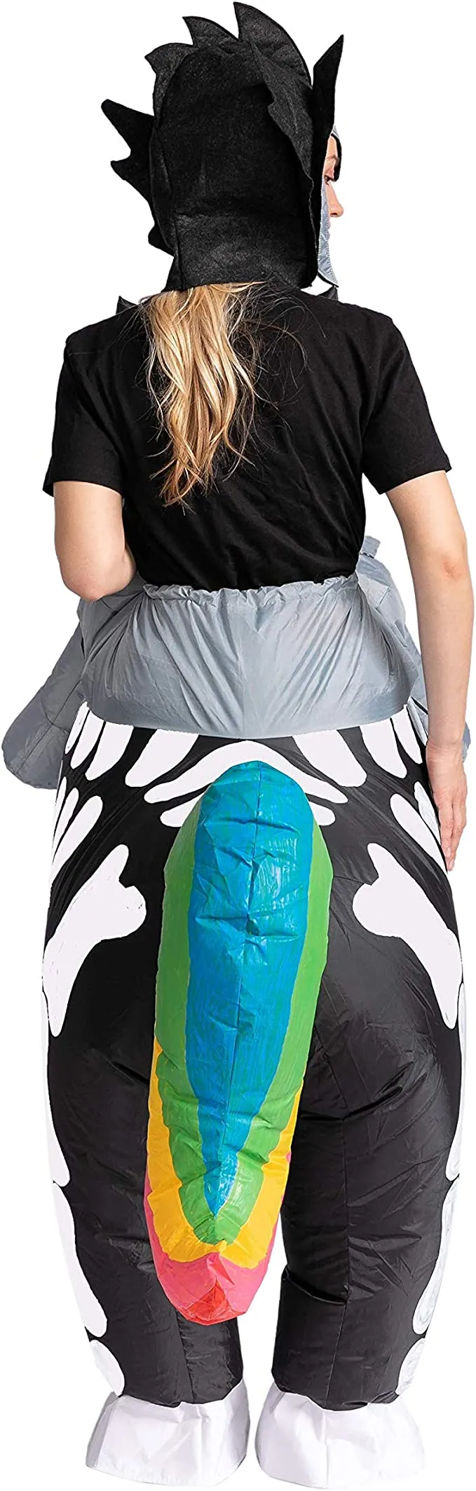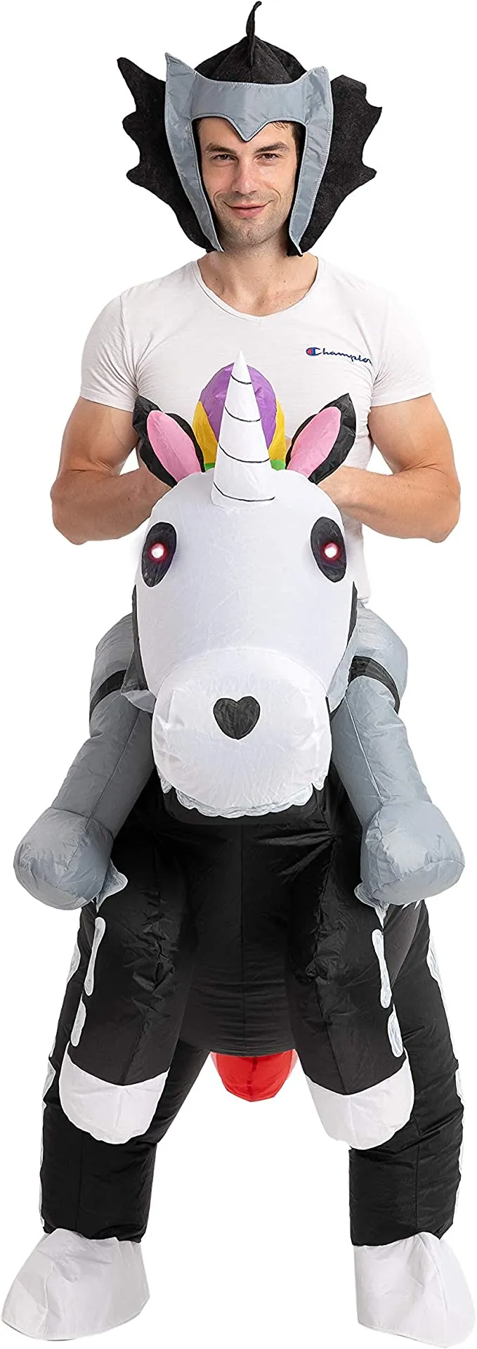 • Skeleton Unicorn Inflatable Costume includes Instruction Sheet, Inflatable Ride-On Suit, and Air Pump. Air Pump Requires Portable Power Bank or 4 AA Batteries. (Batteries Not Included)