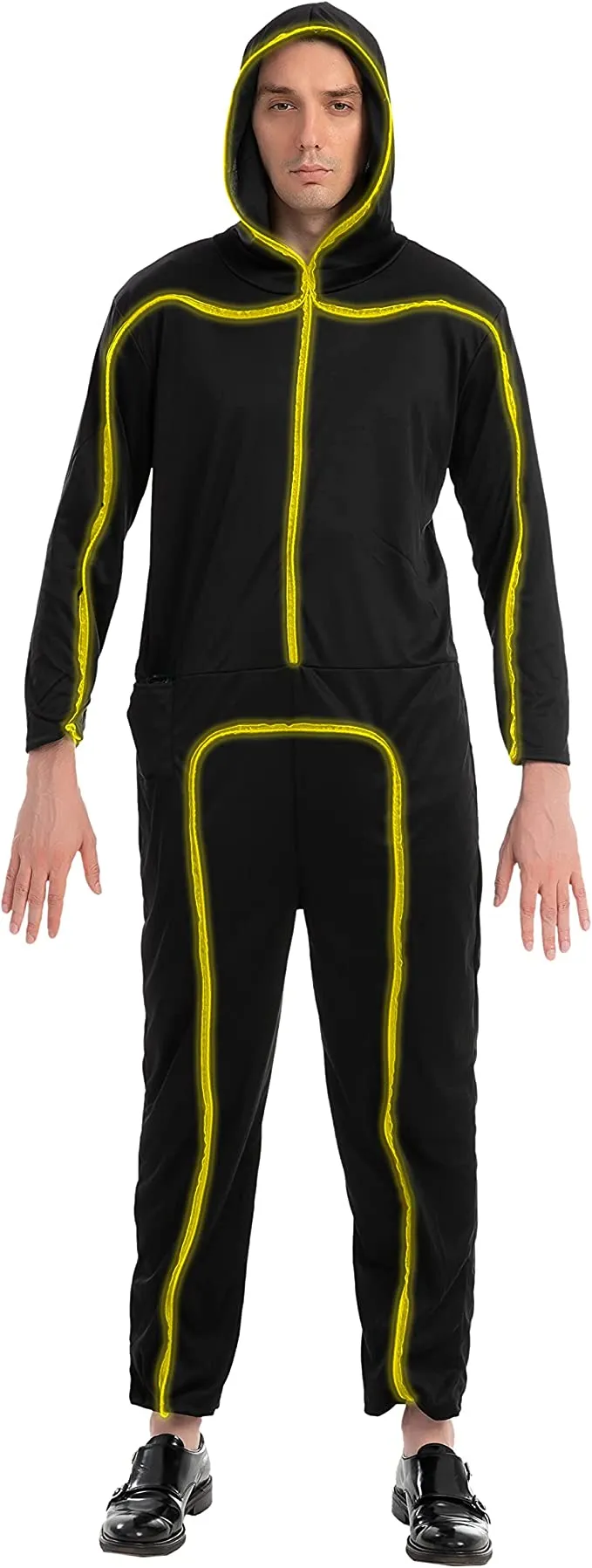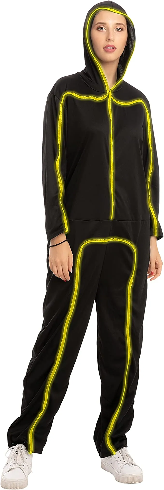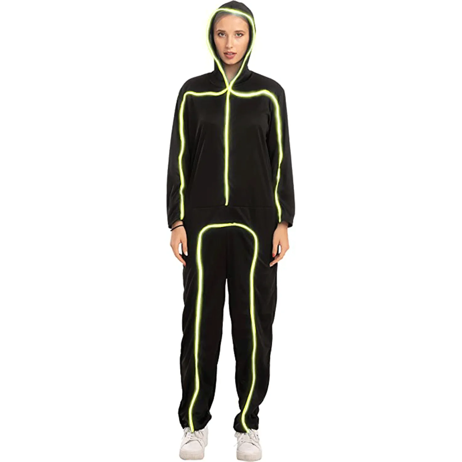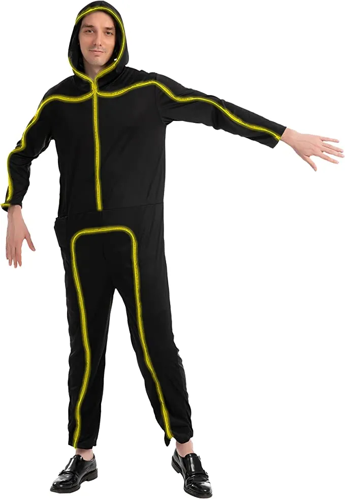 Our LED stick figure costume is a great addition to our adult stick figure costume collection. Featuring wire lighting and battery operated, it can make you glow in the dark while walking around in the dark. Perfect for trick-or-treat play with friends and family, especially those who love being scared by ghosts, vampires, and zombies on Halloween night! Add a little light to your Halloween fun this year with this adult light-up stick figure costume. With wired neon lights, it will make your Halloween party glow in the dark!
