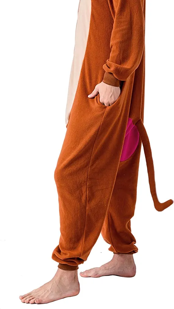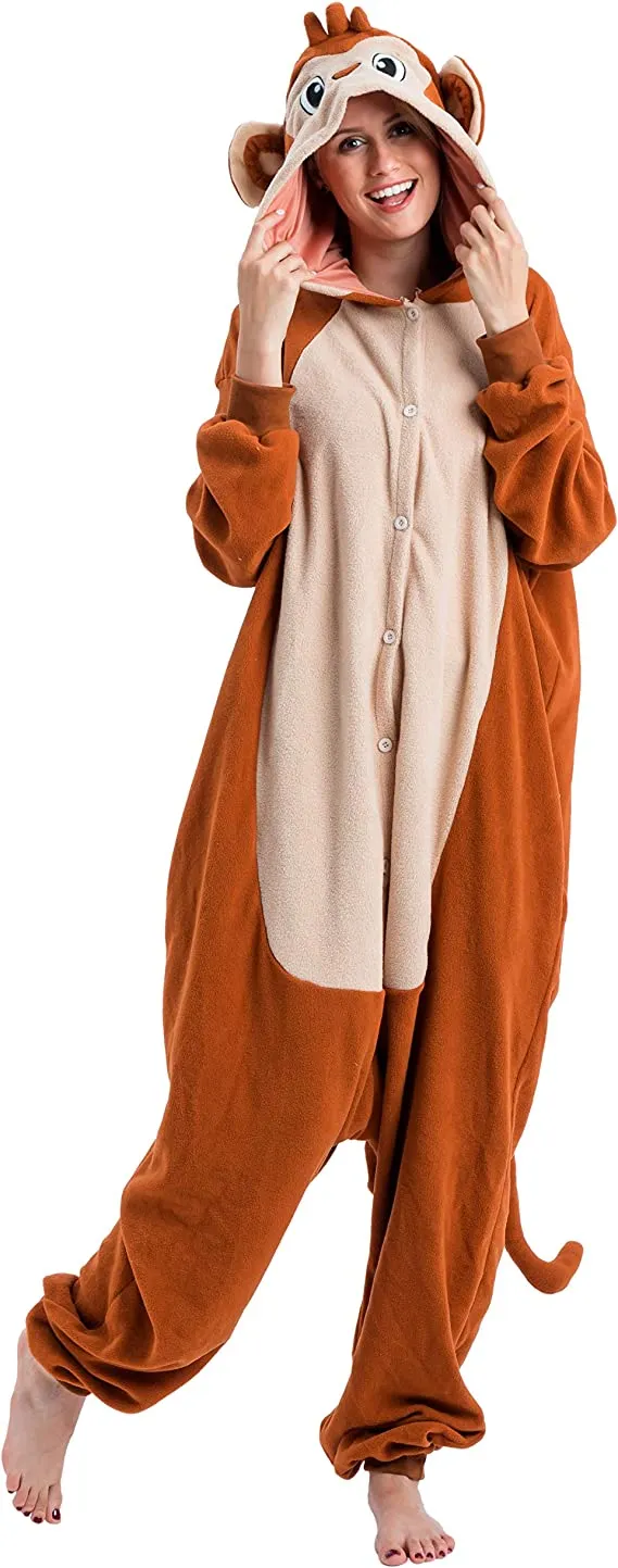• Adult Monkey Onesie Pajamas Includes One Piece Plush Cosplay Animal Costume Onesie. Adult Size. Made with High-Quality Plush Fleece Materials.