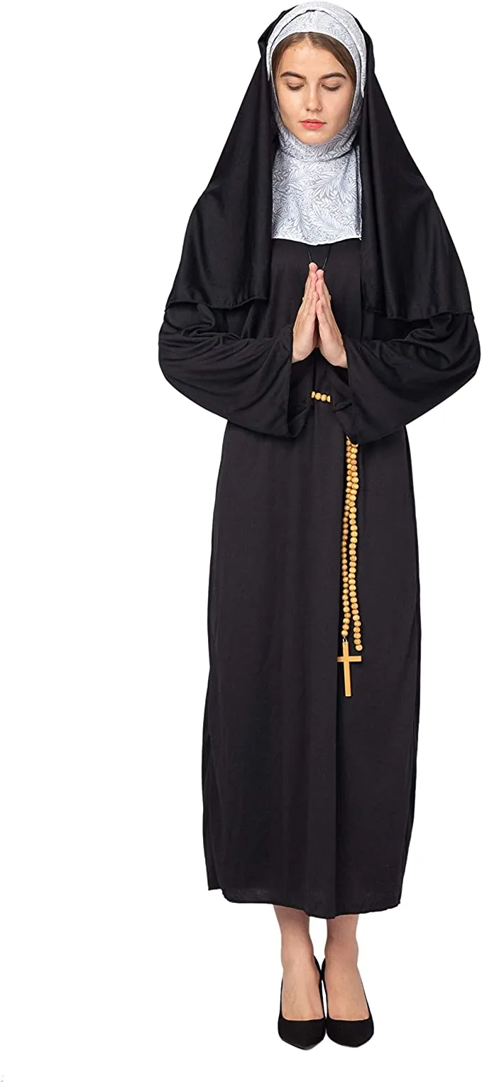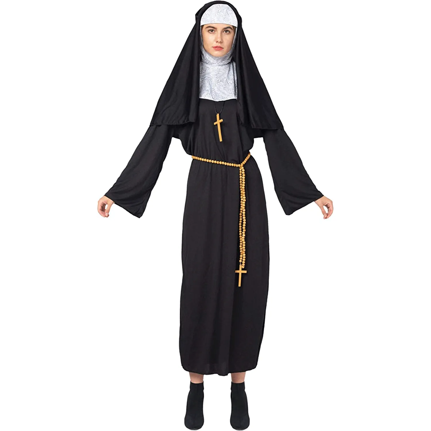 This nun costume is ideal for you if youโre a big fan of the horror film THE NUN. At your next Halloween party, youโll stand out from the crowd if you can pull off some frightening Halloween makeup that makes folks assume youโre the movieโs lead. Do you worry that wearing a costume may make you uncomfortable? The costume for Halloween is composed of polyester. The incredibly sturdy and flexible bodysuit will ensure that you are comfy the entire time. Additionally, plus size is included! Our distinctive attire makes your Halloween event and other theme-related activities a lot of fun, whether youโre attending a party or just hanging out with friends. This is a great costume for your Halloween party and allows you to transform into an adult nun with ease.