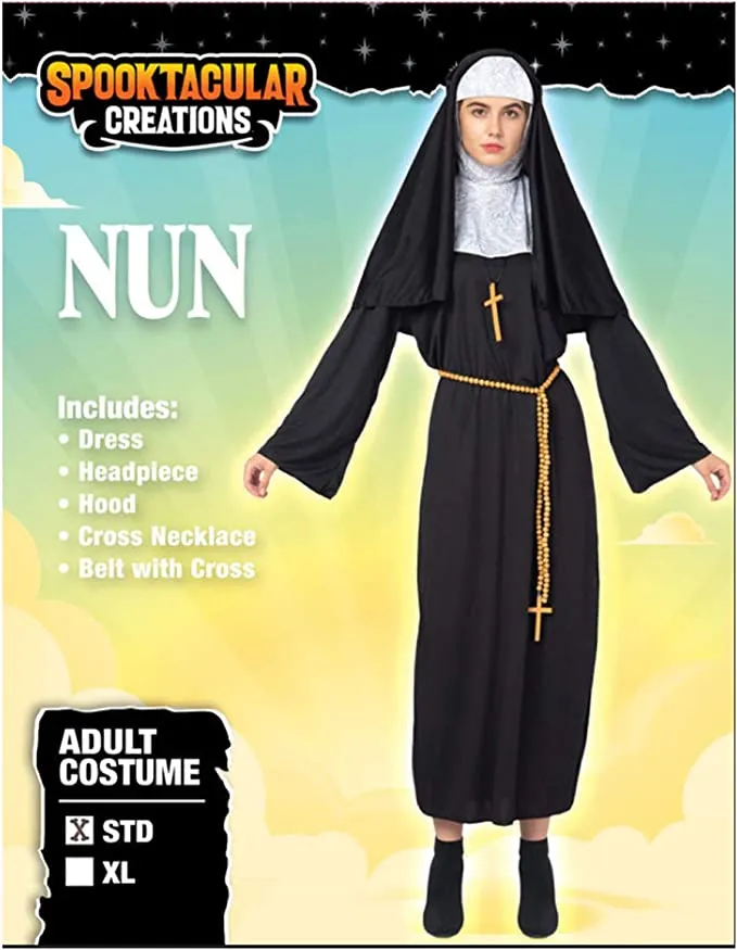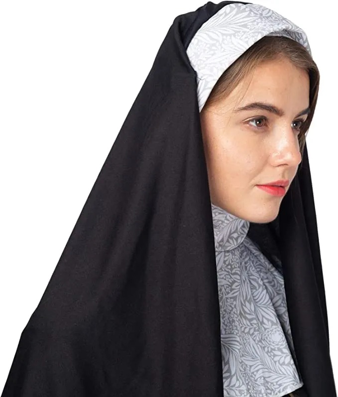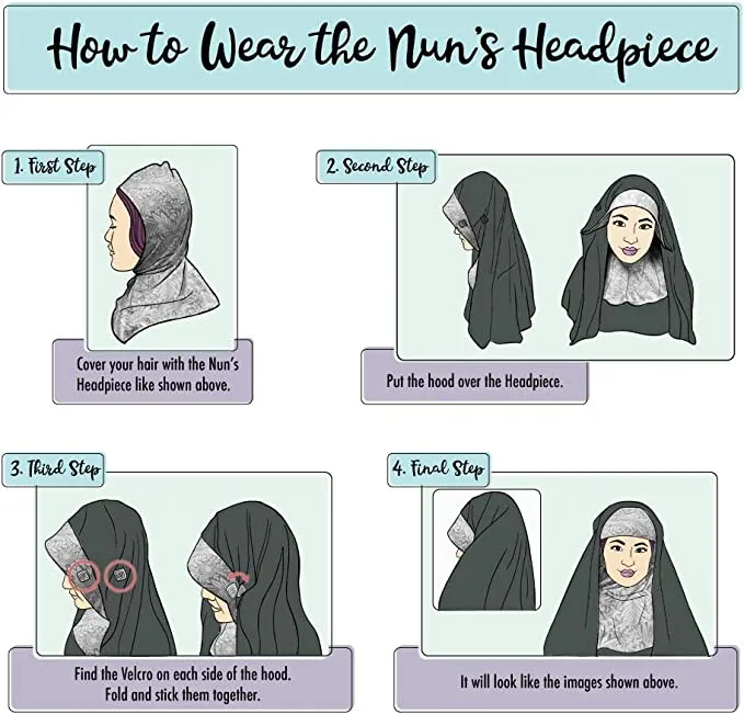 โข Nun Halloween Costume includes Veil, Headpiece with Attached Collar, Necklace, and Drape Belt. Instructions Included for The Hood and The Headpiece.