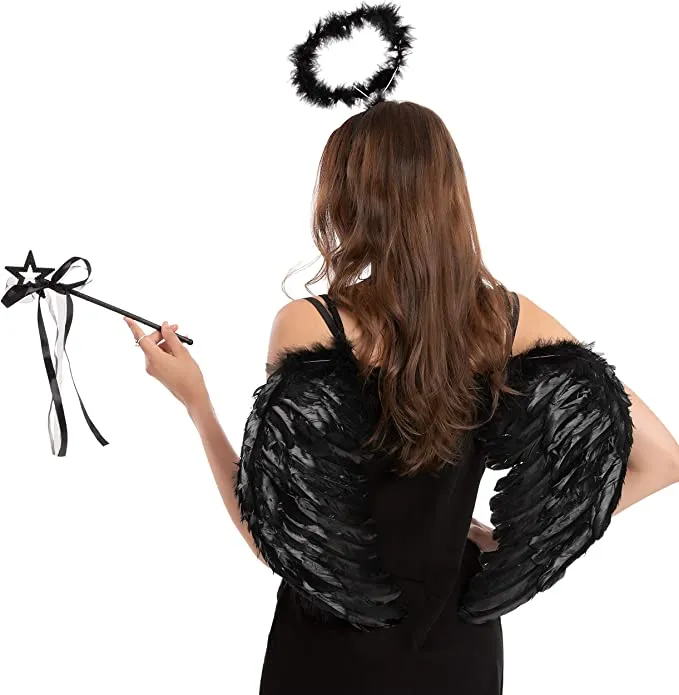β’ Black Angel Wings Halloween Costume includes 1 feather Angel wings, 1 Halo headband, and 1-star wand. These feather wings are easy to wear with elastic straps.