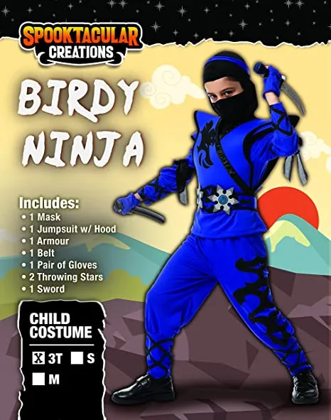 β’ The Blue Ninja Toddler Costume set features 1 Mask, 1 Jumpsuit w/ hood, 1 Armour, 1 Belt, 1 Pair of gloves, 1 Sword, and other foam accessories.
