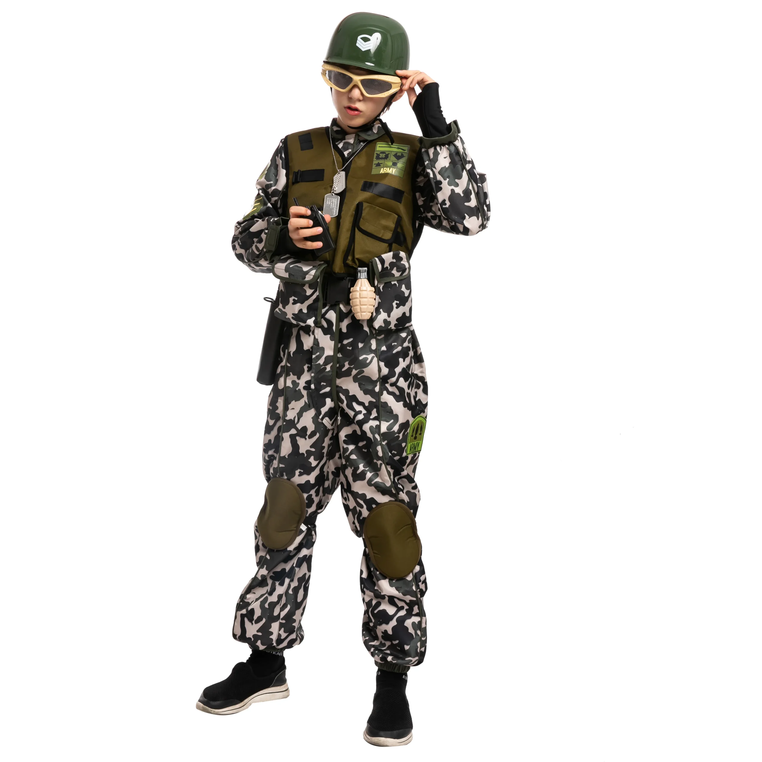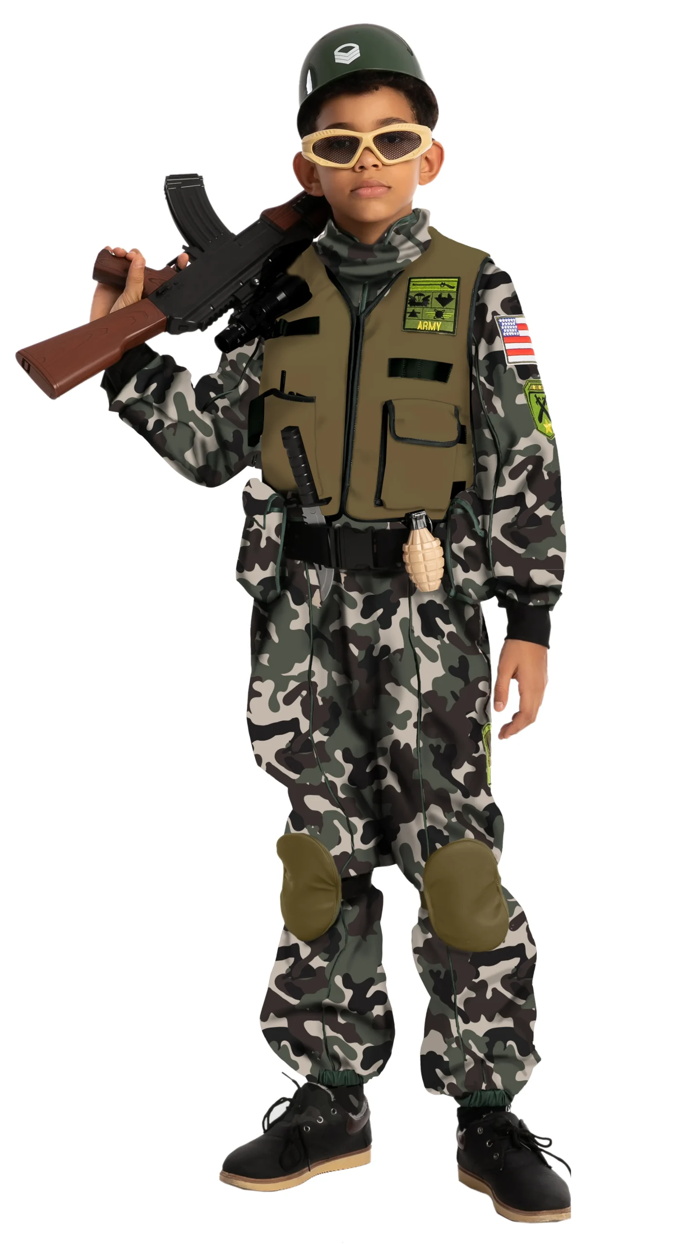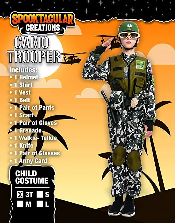 • Our Camo Soldier Costume includes a Foam Vest, Jumpsuit w/ Knee Pad, Belt w/ Pouches, Helmet, Name Tag, Glasses, Walkie-Talkie, other two toy accessories, and a Bandanna.