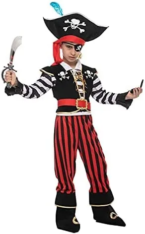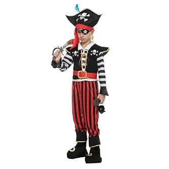 Look no further than this pirate costume to outfit your kid friend’s captain in a high seas looks. He will be destined to lead his crew of scoundrels to the greatest loot, the most exciting locations, and to raid and plunder every ship owned by the King once he obtains this outfit. He will have everything he needs to set sail, including pants, a belt, a hat, a pair of shoes, a compass, a pirate sword, earrings, a coin purse with 6 coins, and a scarf. It is designed to look like a shirt and vest combination. He will certainly feel like a genuine pirate thanks to the stylish skull printing on the accompanying vest, which goes perfectly with the jacket’s roughhewn stitching.