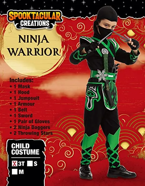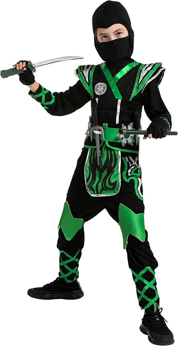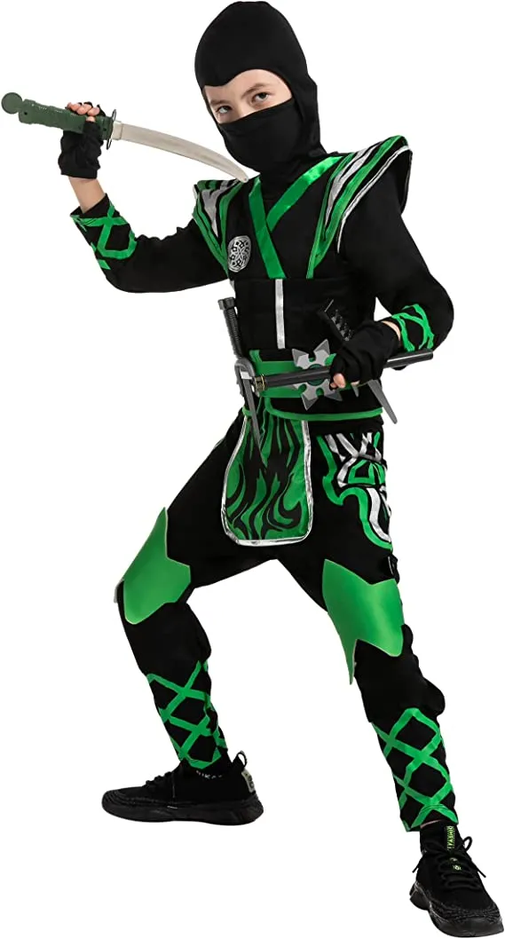 The green ninja costume is the perfect outfit to give your child a little extra confidence in their role-playing. This set features a mask, hood, jumpsuit and armor, belt, one pair of gloves, and other foam accessories. The mask has eye holes as well as an adjustable elastic chin strap that makes it easy to fit over your childβs head. This little ninja costume is the perfect outfit for a young boy who wants to dress up as his favorite superhero. Itβs a fun time for kiddos with this amazing and super durable ninja costume for boys. The foam weapons and accessories on this costume can withstand all kinds of rough play. Great for Halloween dress-up parties and ideal for pretending action games outside, this set will make a great gift for your little one on his birthday.
