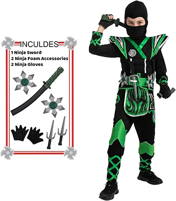 β’ Boys Ninja Costume Includes a mask, hood, jumpsuit, armor, belt, one pair of gloves, one ninja dagger, and other foam accessories.