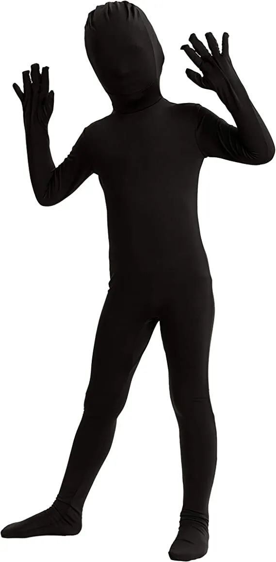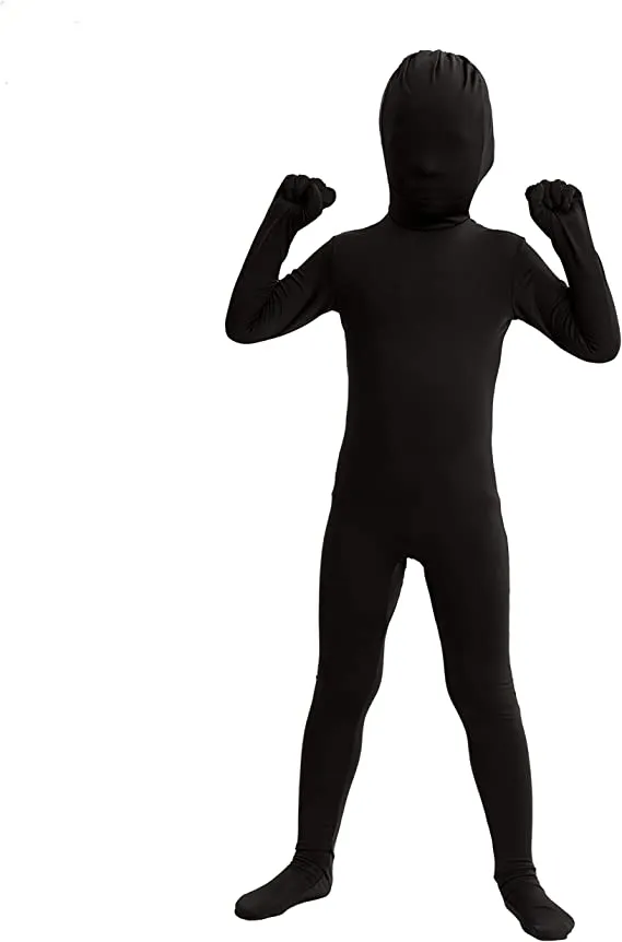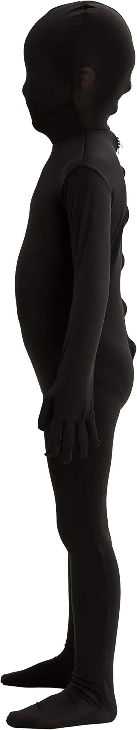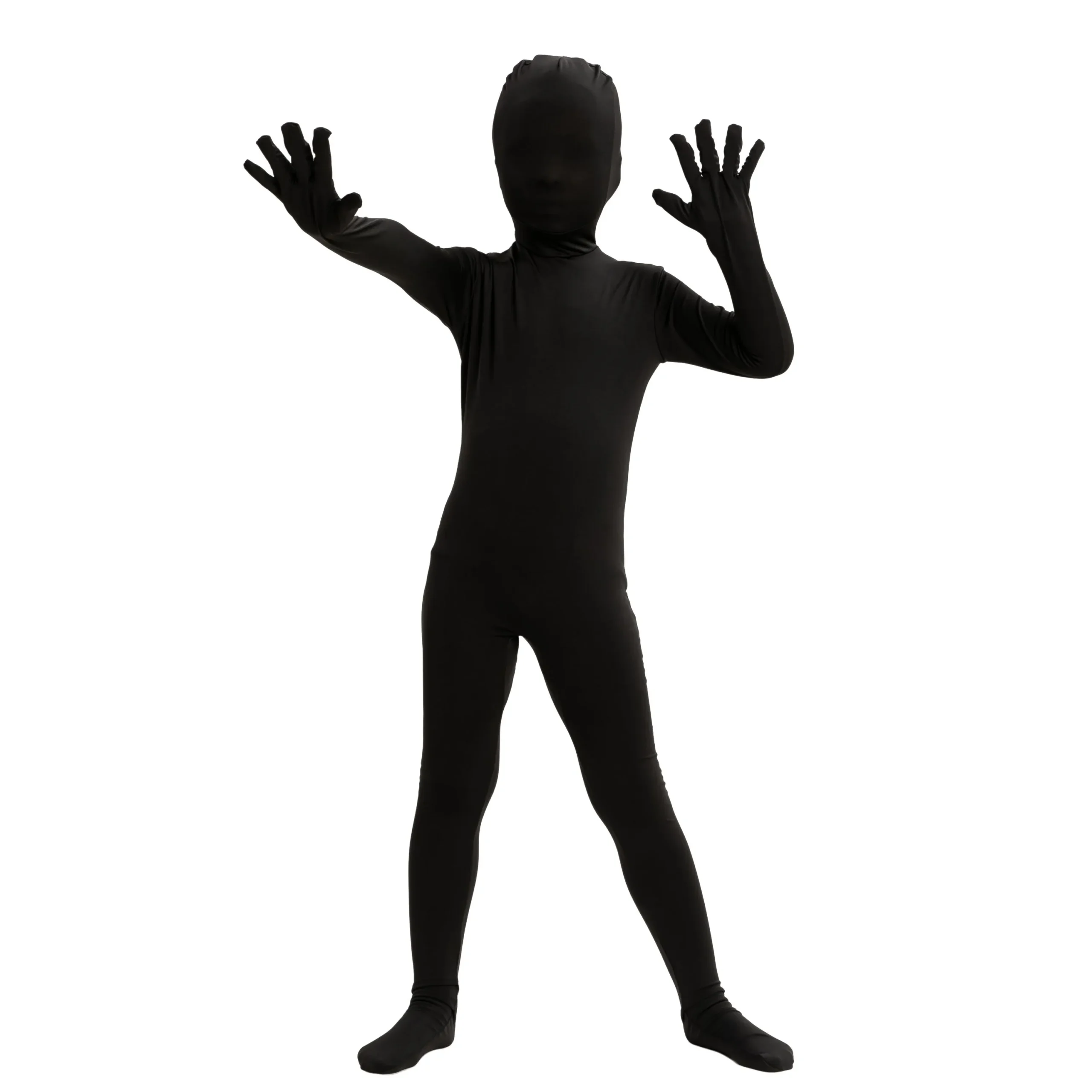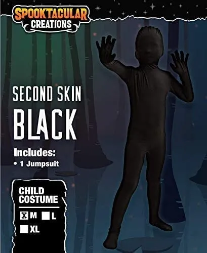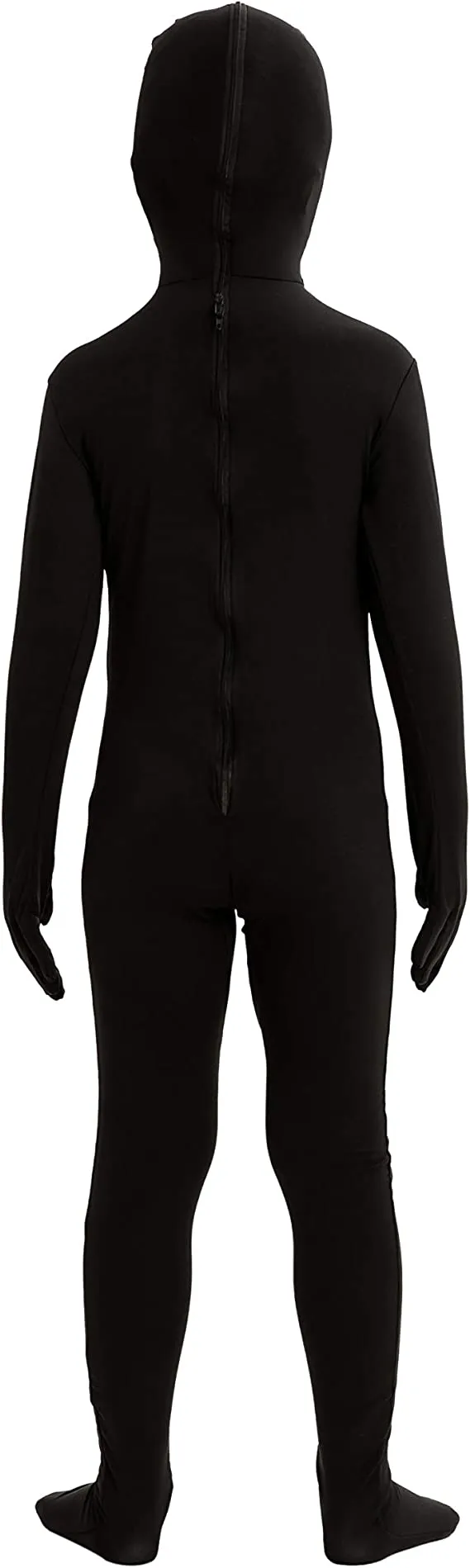 Second skin costume is turning heads and demanding attention is made easy with our black 2nd skinsuit kids Halloween costumes. It will be giving their character a bold and confident look. From the second skinsuit collection, our kidβs black skinsuit costume includes a skintight black jumpsuit made of a stretch poly-spandex for a snug fit that covers the entire body from head to toe with its attached hood headpiece, gloves, and feet covers. It features a zipper back and is lightweight and breathable.