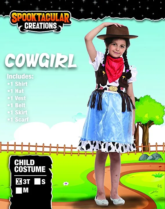 This cowgirl costume is perfect for Halloween trick-or-treating, birthday parties, Halloween costume dress-up, children’s costume parties, cute cowgirl cosplay, everyday play, or any other fun-filled night! Rope ’em! Being a cowgirl is difficult to work, but it’s even more difficult to maintain a cute appearance while wrangling all of those cattle. Put on this costume and your girl will be ready to hit the ranch. We can’t say whether she’ll enjoy the life of a cattle-woman, but she’ll certainly look adorable doing it! Let her be the star of this Halloween with this costume as she collects her treats. Yes, she’s implying to be Halloween’s cutest cowgirl. She’ll be ready to ride off into the sunset in this adorable costume!