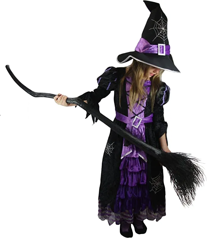 This girls witch costume is made of opulent polyester and is dripping with sparkles. The dress has a high collar for a dramatic silhouette and a lush-looking strip down the front. The dress has flowing sleeves and is ankle length. The dress’s polyester is rich and sparkling all around. A rectangular rhinestone buckle sits in the middle. A rectangular buckle and black and purple trim are added to the dazzling cap on top.