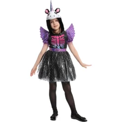β’ Unicorn Tutu Dress Costume Includes a unicorn skeleton dress with a hood and a pair of wings.