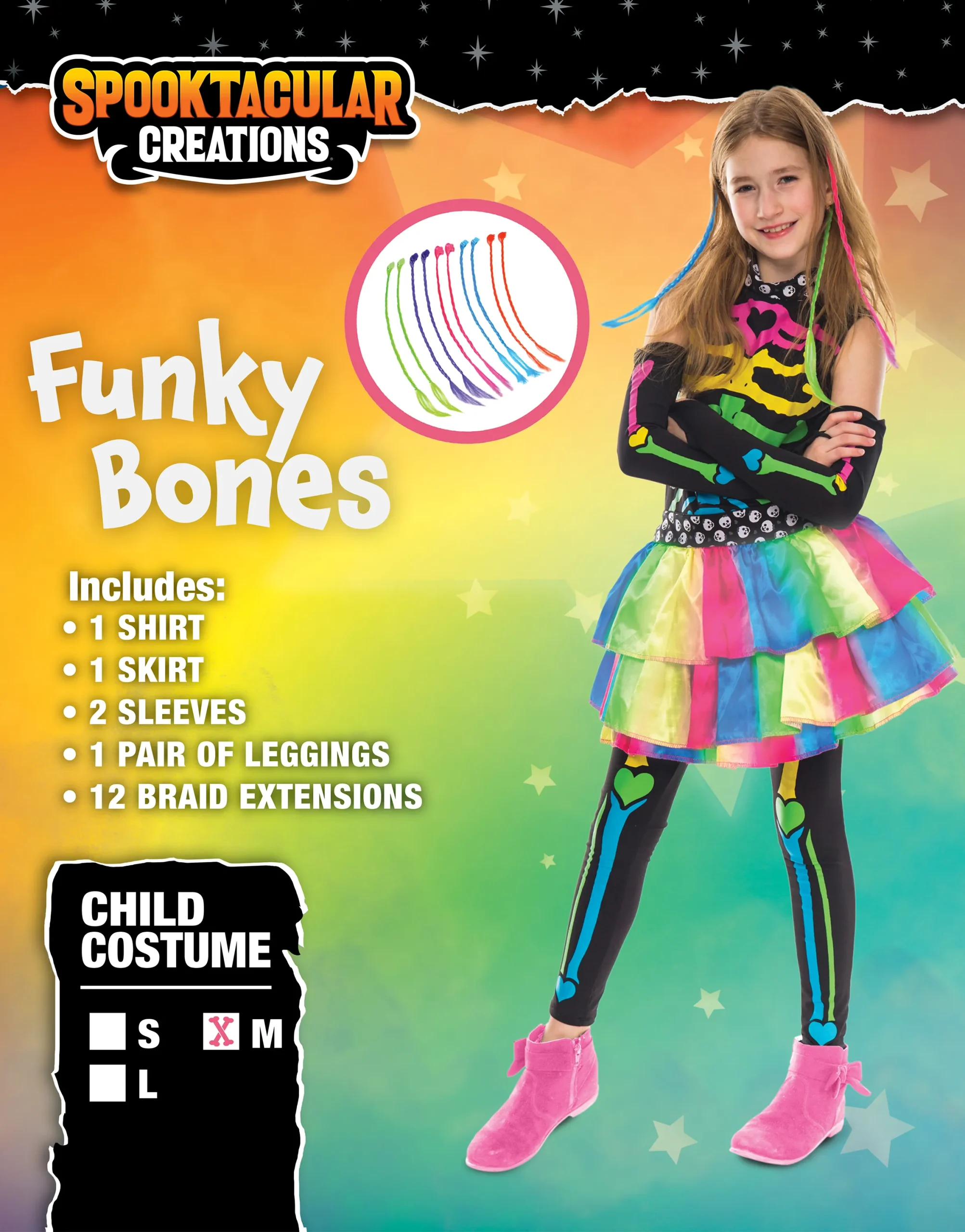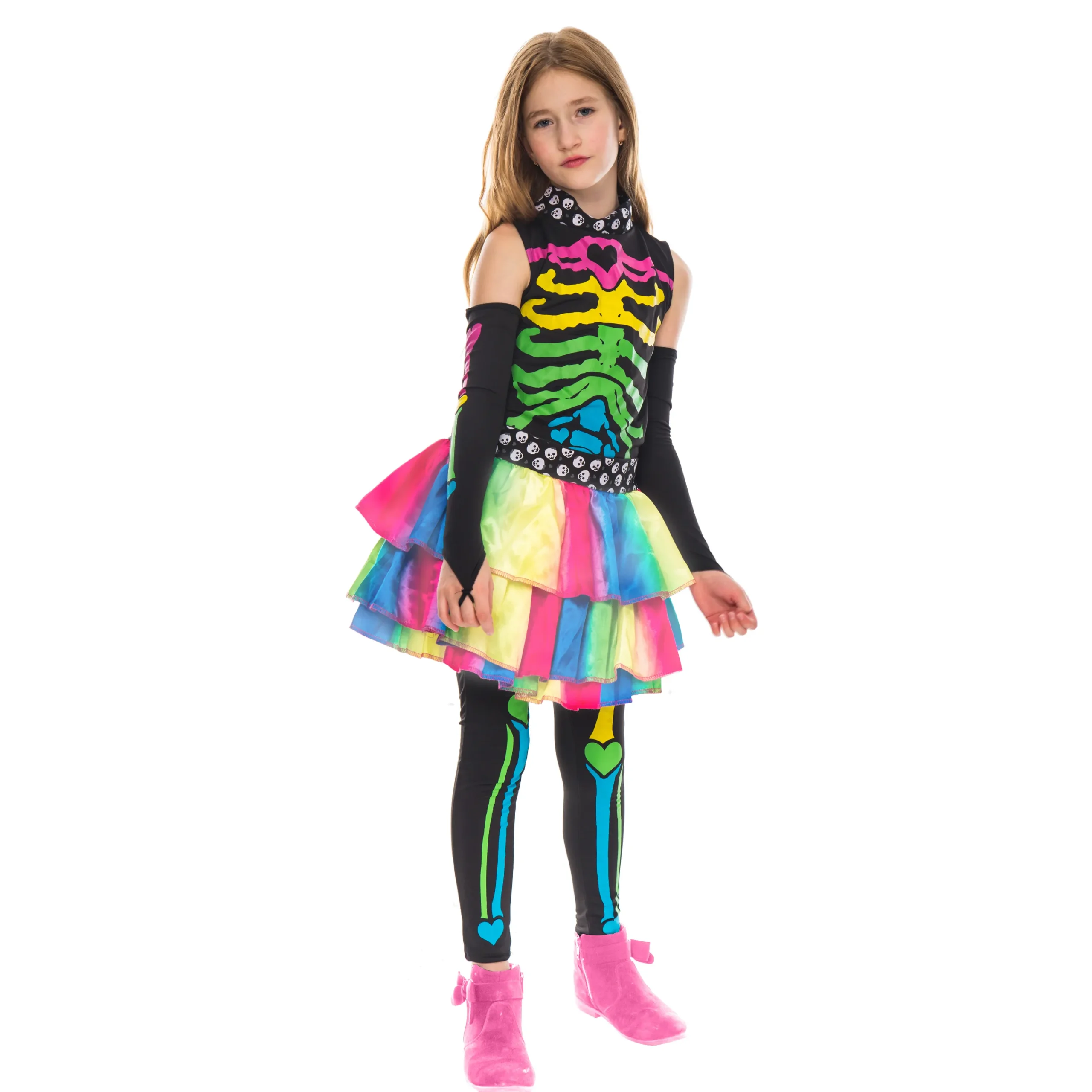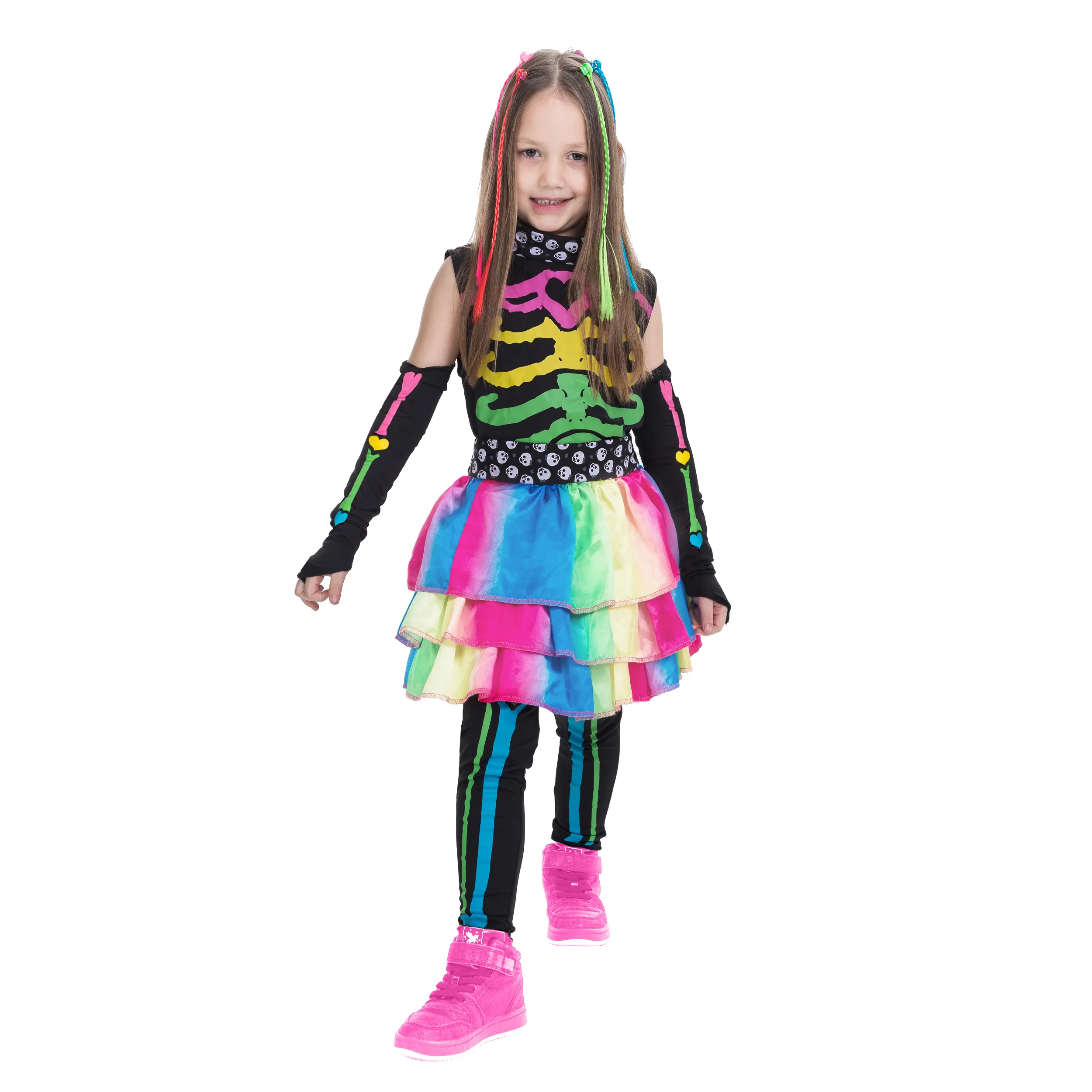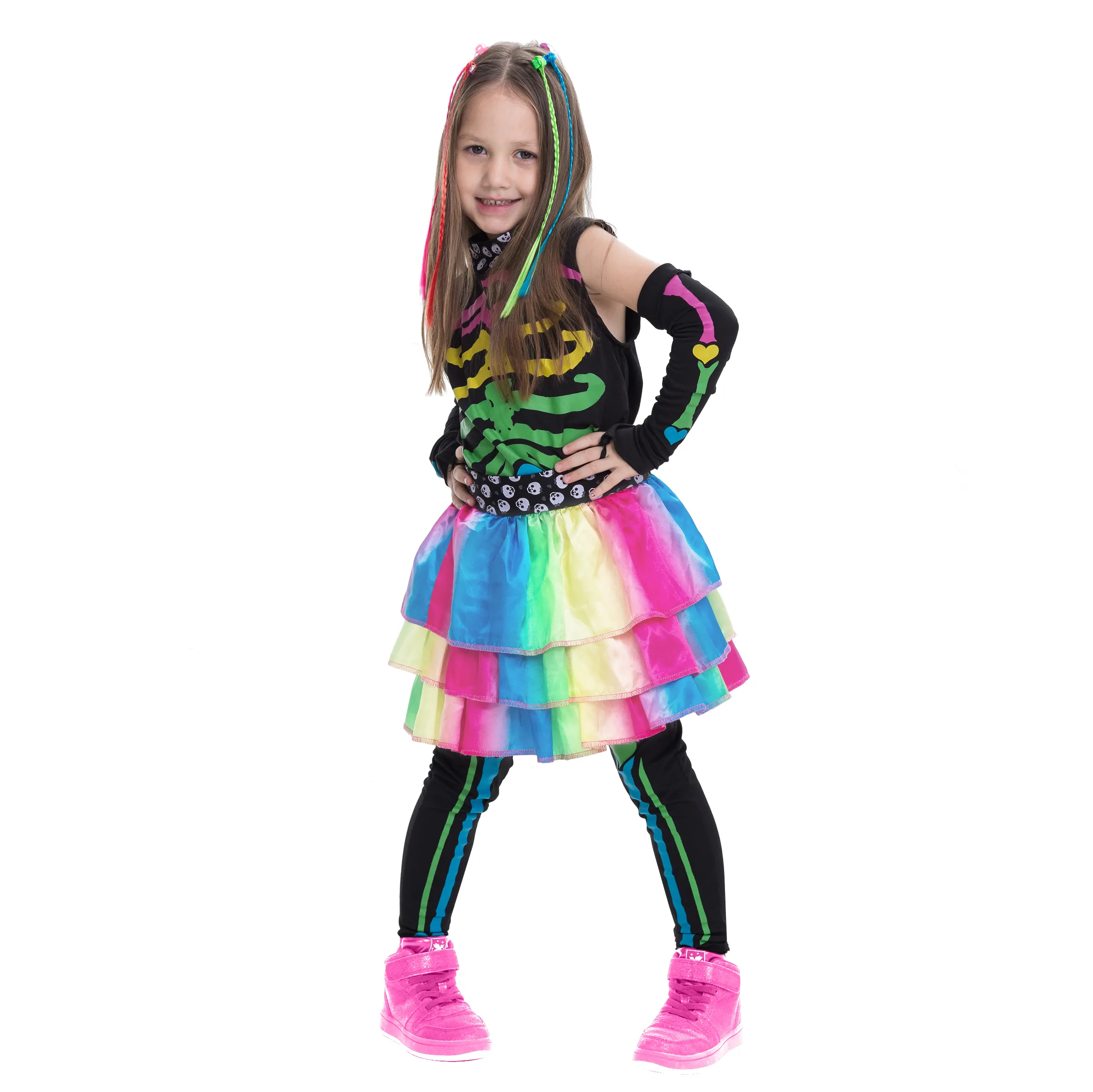 • Girls Skeleton Halloween Costume Includes Multi-Colored Shirt, Skirt, 2 Sleeves, a Pair of Leggings, and Hair Extensions!