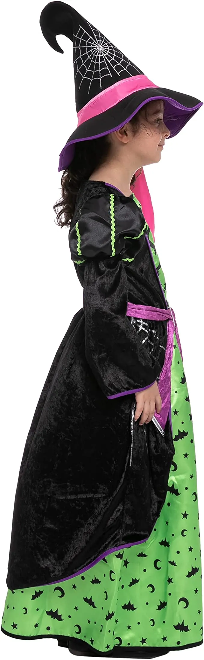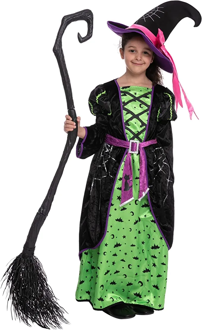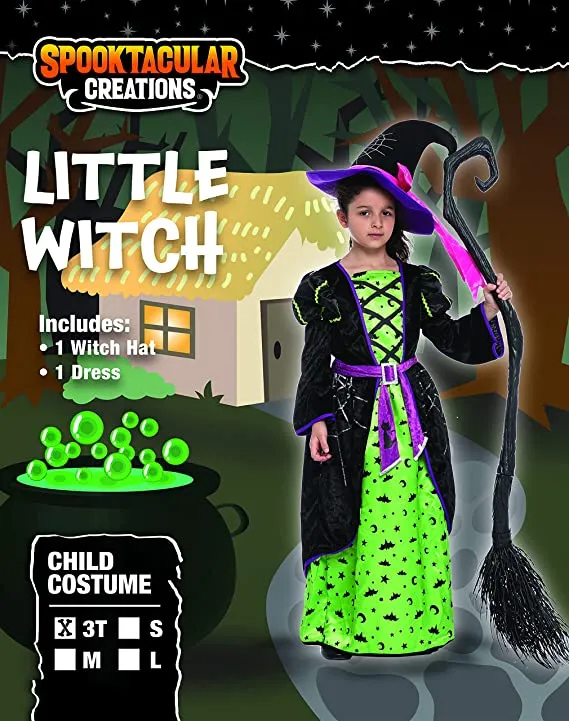 Let your little one don a witchβs hat and slip on this green witch costume. Sheβll be ready to cast her spells at any moment! Our witch costume is the perfect choice for your little girlβs Halloween dress-up costume! This bright green dress with a matching hat will keep her feeling comfortable, while sheβs wearing it and imagining herself as a fairy tale princess. A green dress with an attached black overcoat and a matching hat makes it very attractive. Made of high-quality polyester fabric, the costume is durable and comfortable to wear. Suitable for 3 years old kids up to 9 years old young girls. This classic costume is a must-have for everyone who wants to have fun playing the part of a witch.
