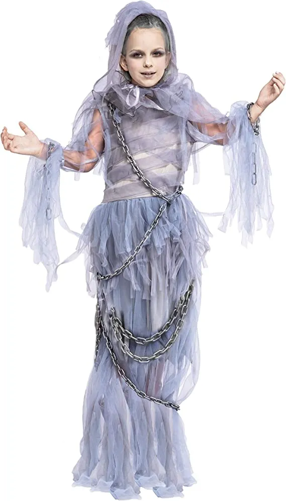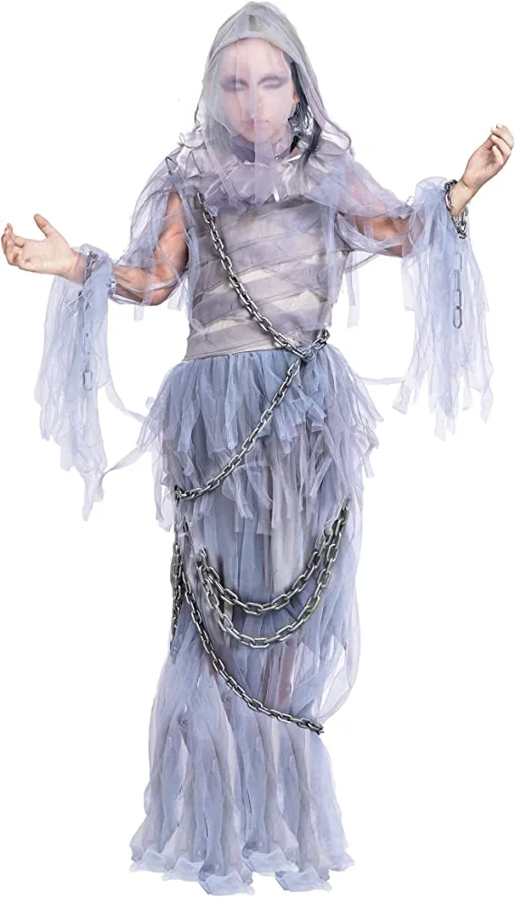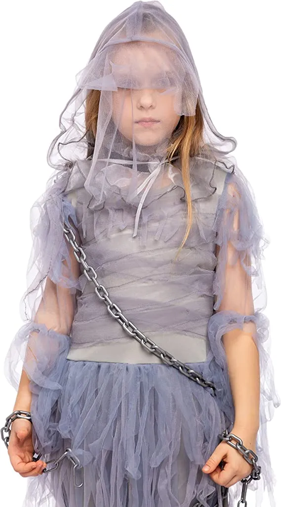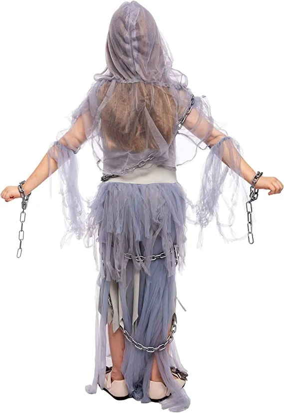 • Ghost Costume Halloween Girl Includes Tattered Dress, Chains, Collar, and White Cape with Attached Hood