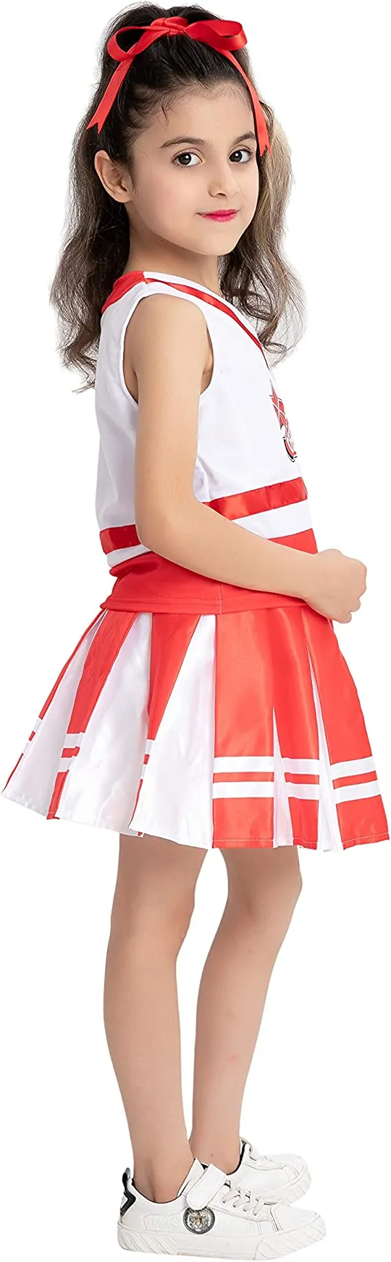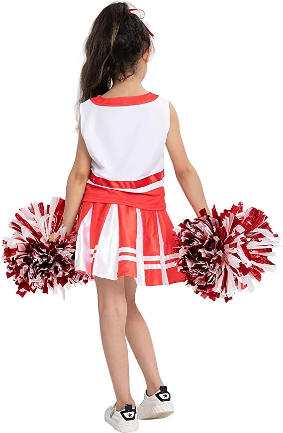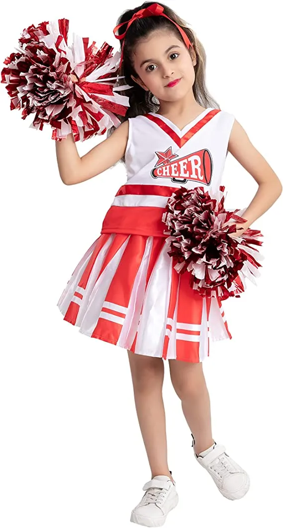 β’ Girls Cheerleader Halloween Costume Includes Printed Top, Two Pom Poms, Pleated Skirt, and One Red Ribbon