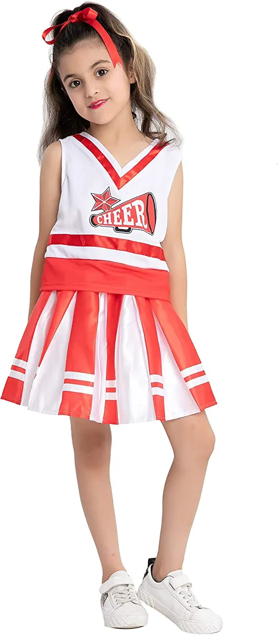 This girls cheerleader costume helps any young girl get the look of a cute cheerleader. This costume includes a printed top, two pom poms, a pleated skirt, and one red ribbon. A vibrant red dress with a sparkling skirt is included with the costume. βCheerβ is written across the front of the dress, and there are striped ribbon appliques across the chest. With this athletic skirt and tank top, your little athlete in training may flaunt her upbeat spirit.