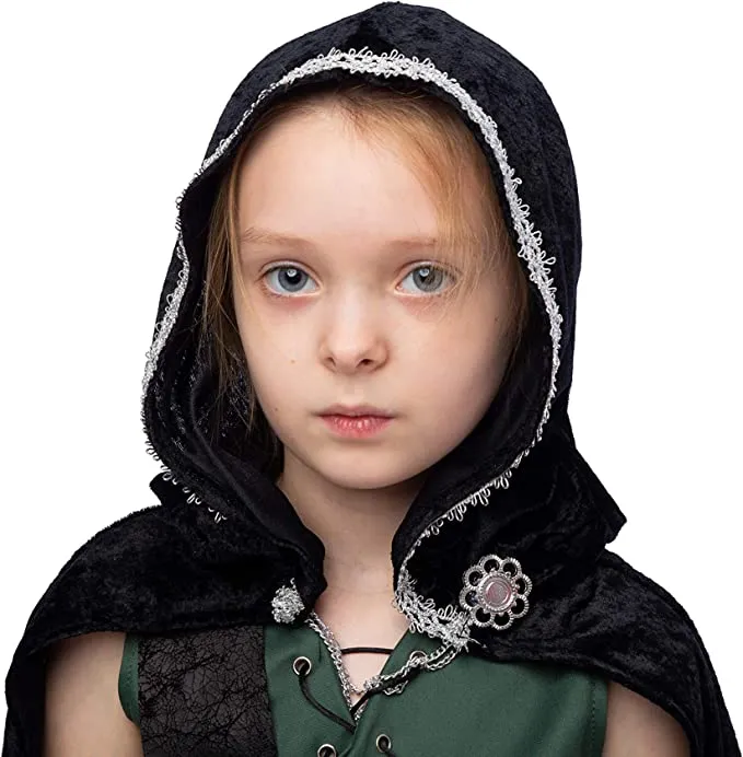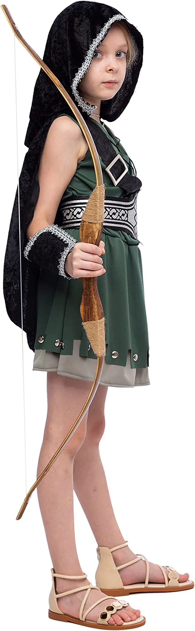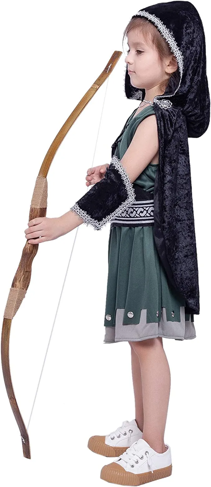 This huntress costume is ideal for your childโs next adventure in the woods. The costume is perfect for any young girl who enjoys archery or hunting. A cape with an attached hood, a tunic dress with a lace-up front, a printed waist belt, shoulder straps, a cord for dress lacing, and gauntlets are included in the ensemble. The tunic has an elastic waistband for ease of dressing and a button-up back to keep it in place. The cape is made of polyester, a sturdy material that can withstand normal wear and tear.