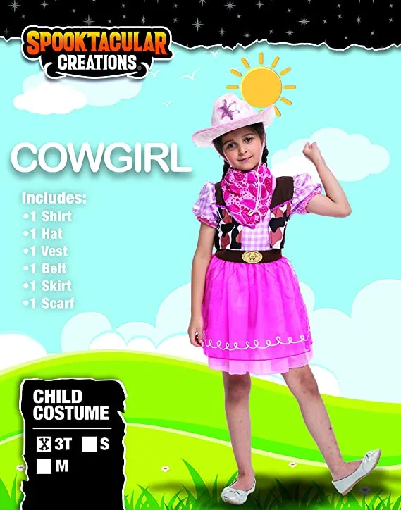• This Cowgirl Halloween Costume set includes 1 Shirt, 1 Hat, 1 Vest, 1 Belt, and 1 Skirt. and 1 Scarf. Has a cute cowgirl design in pink color.