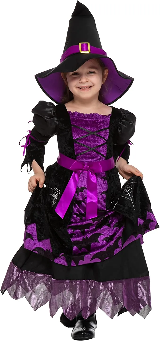Check out this girls witch costume for the best witch Halloween costume! We have just what you need for casting spells and riding your broom into the sky! We have cute costumes for girls! Want to transform completely? This witch costume will let your little one feel comfortable as a powerful, magical being. The magical witch look comes with a witchβs matching hat and a full-skirted dress. Whatever completes the enchanted picture your child has in their imagination. Your child will feel fantastic in this outfit even though she canβt fly to school on a broom or concoct a potion thatβs stronger than lemonade.