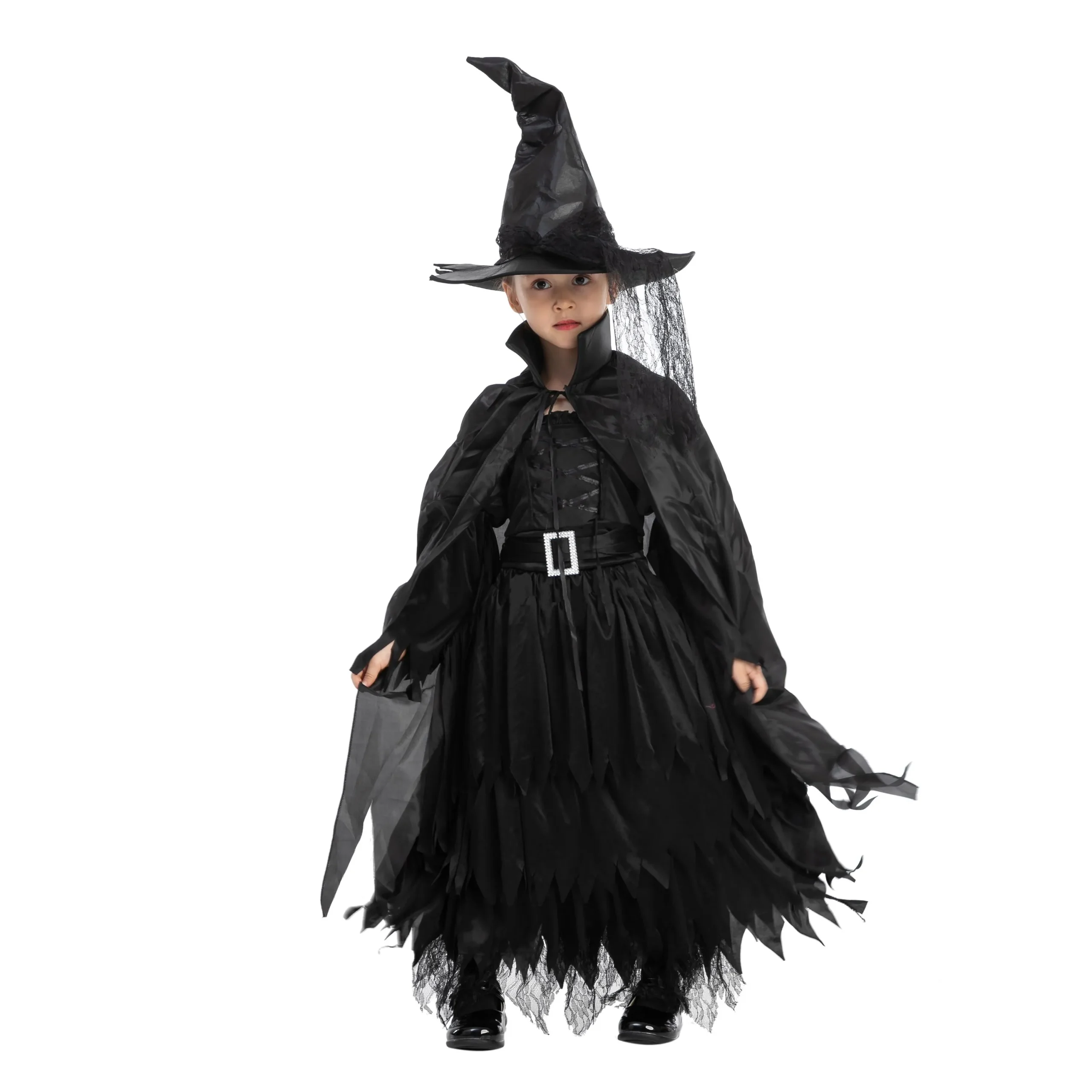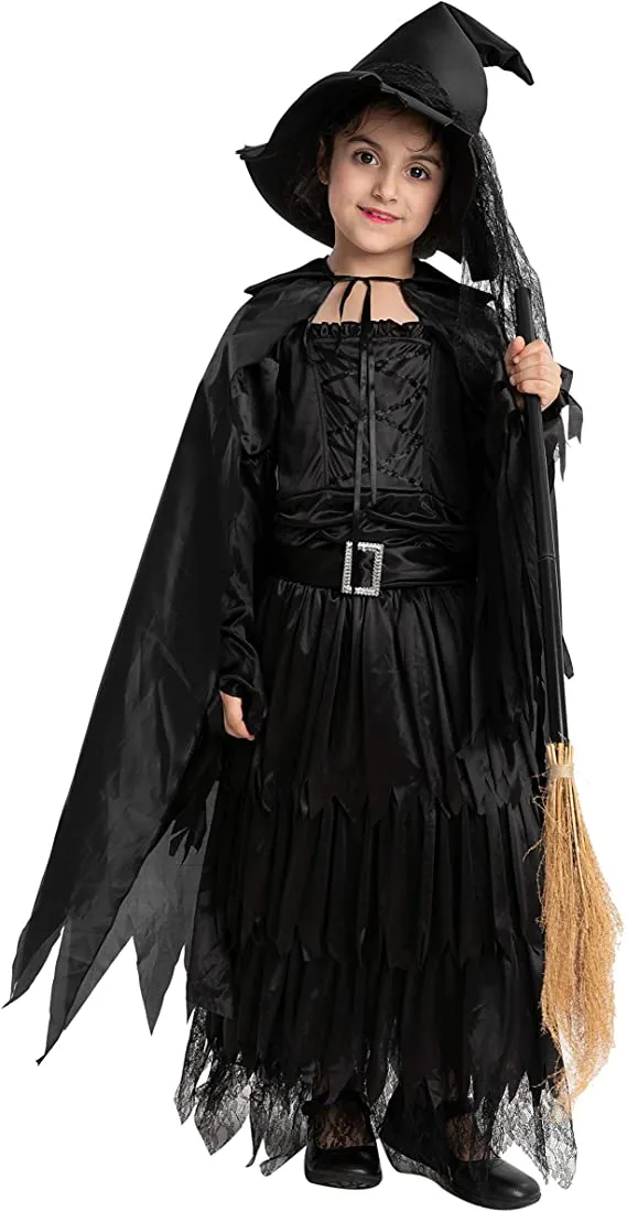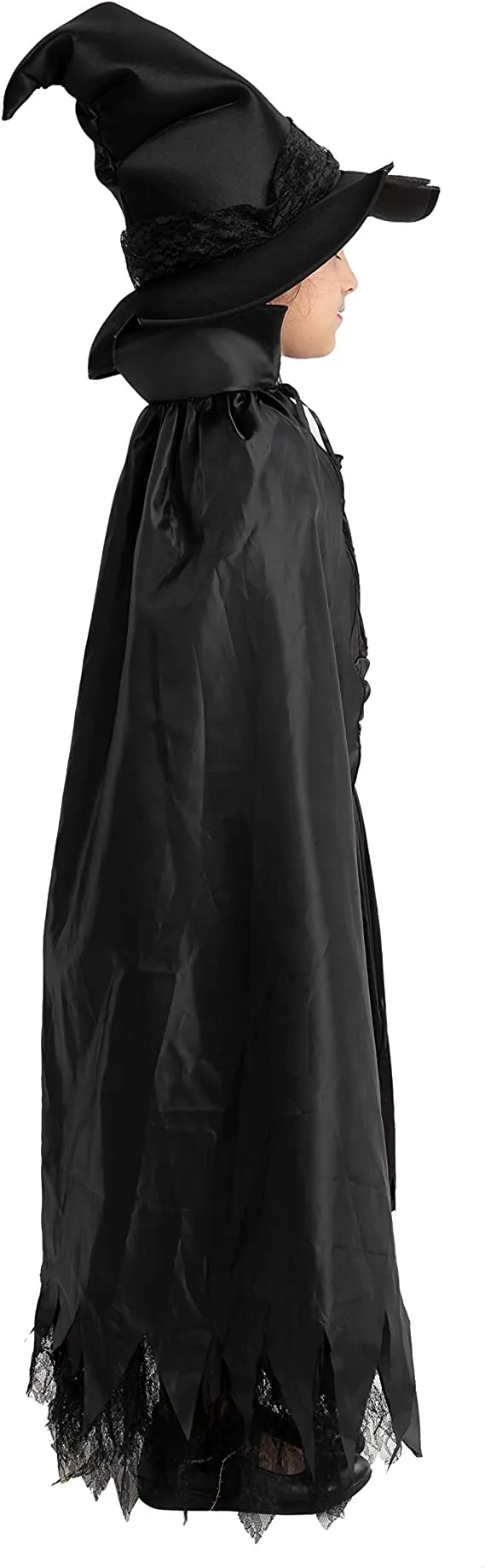 • Girls Witch Halloween Costume Includes Witch’s Hat, Long Sleeved Dress, and Cape