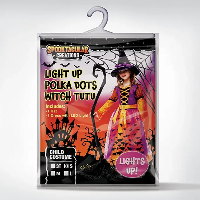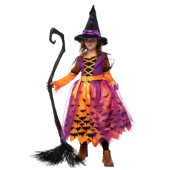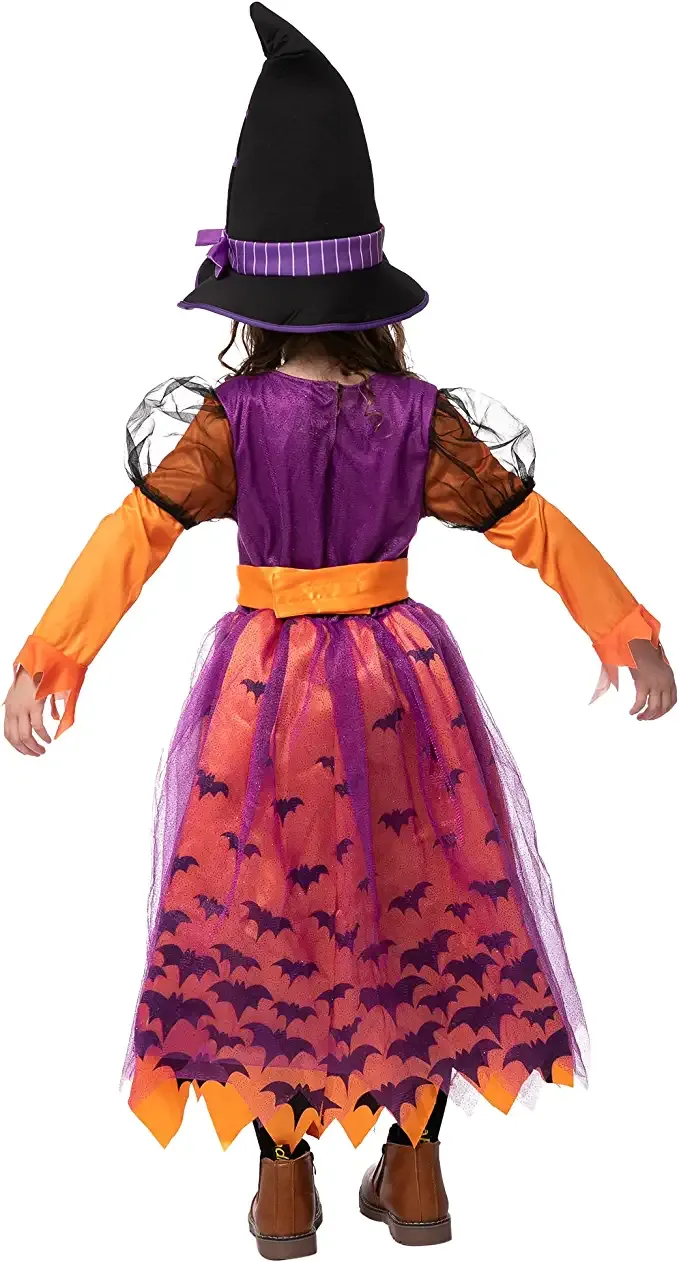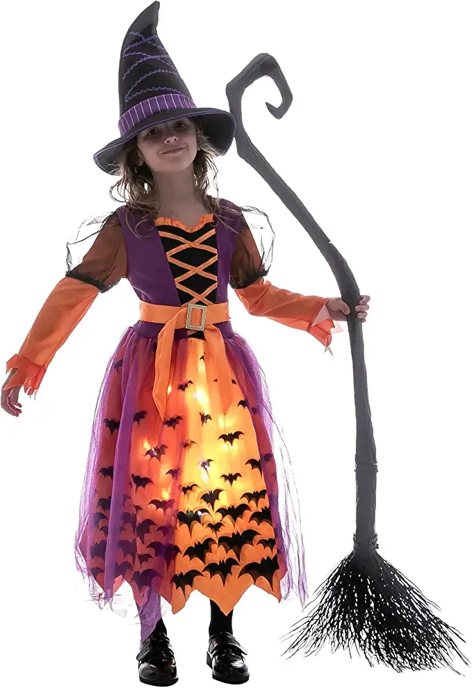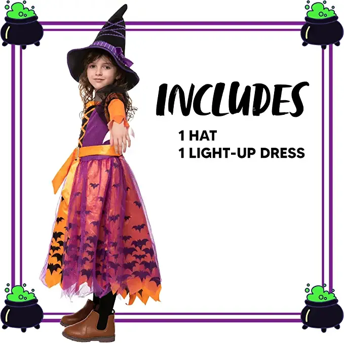 β’ Witch Tutu Costume Includes Witchβs Matching Hat and a Long Purple and Orange Dress. The orange skirt of this dress has LED light and a bat pattern print.