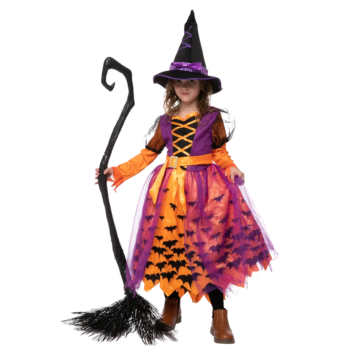 This tutu witch costume Includes Witchβs Matching Hat and a Long Purple and Orange Dress. This dressβs orange skirt features LED lighting and a bat pattern print. Our wild witch child costume will let your little lady break the mold in this funky and fun take on the classic girl costumes. A costume that is sure to let her personality shine, no hocus pocus!