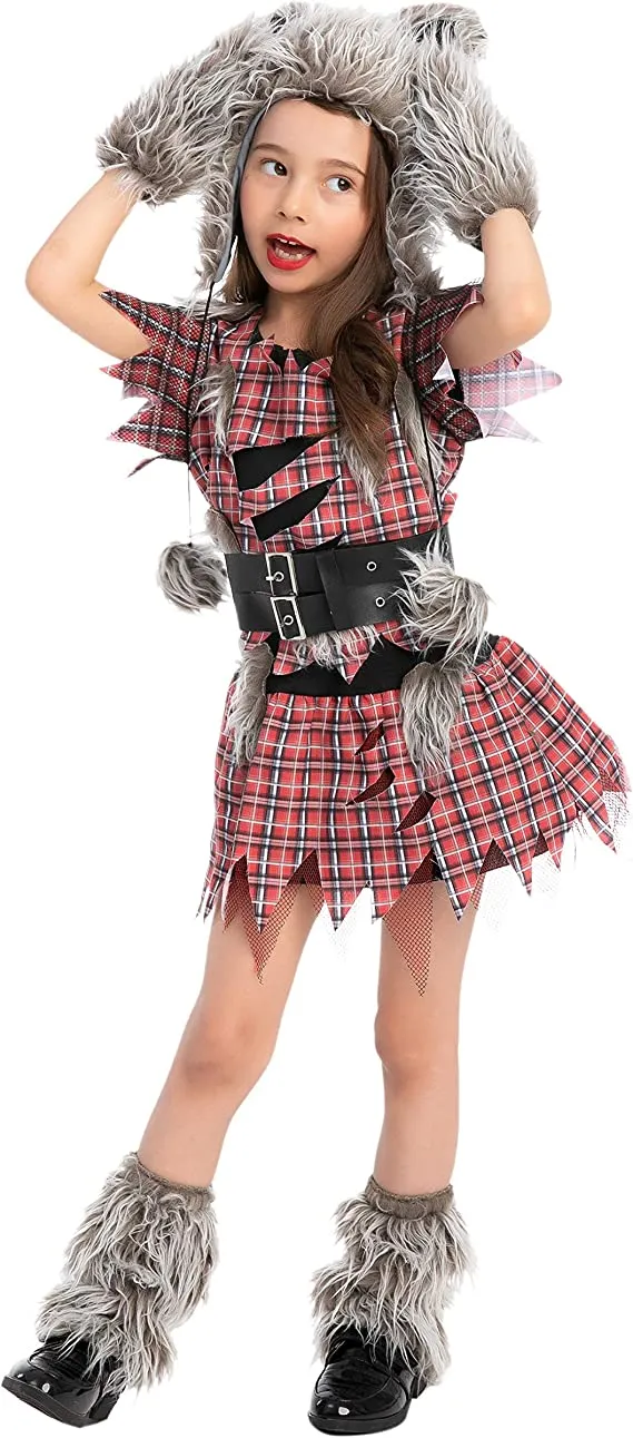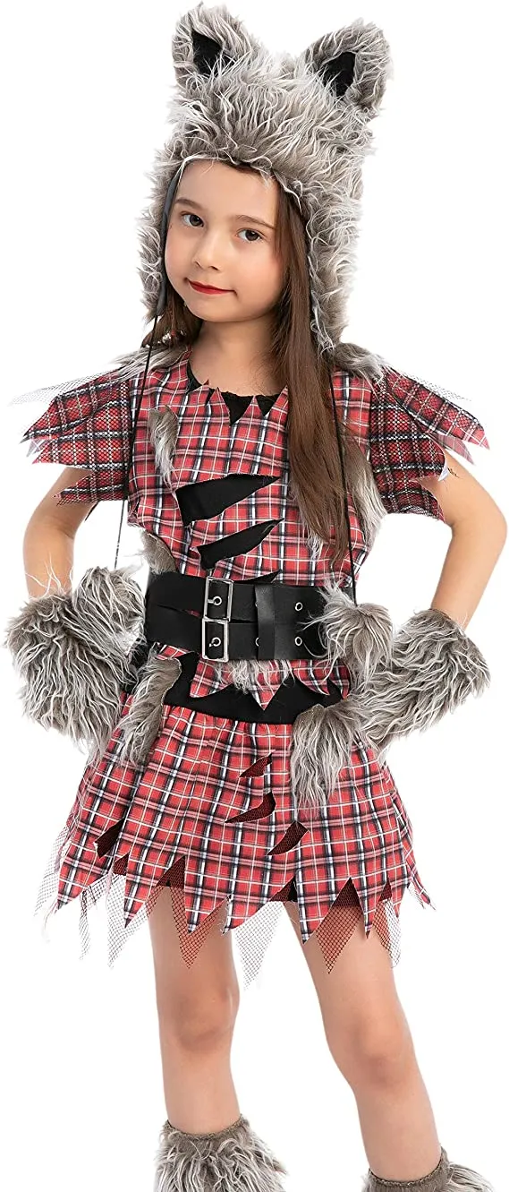 β’ Girl Wolf Halloween Costume Includes a Hood, Gloves, Dress w/ Belt, Shoe covers