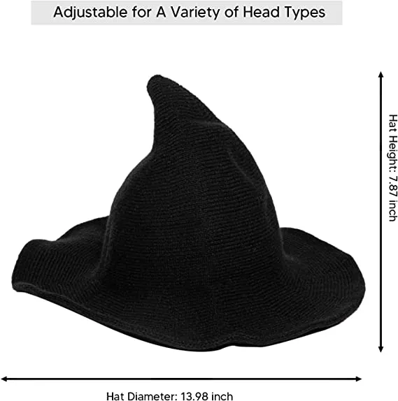 • Overall Hat Diameter: 13.98″; Hood Width: 7.87″; Hat Height: 7.87″. Perfect for adult women to wear. The knitted witch hat has wires on the brim, which means you can create different hat styles as you like.