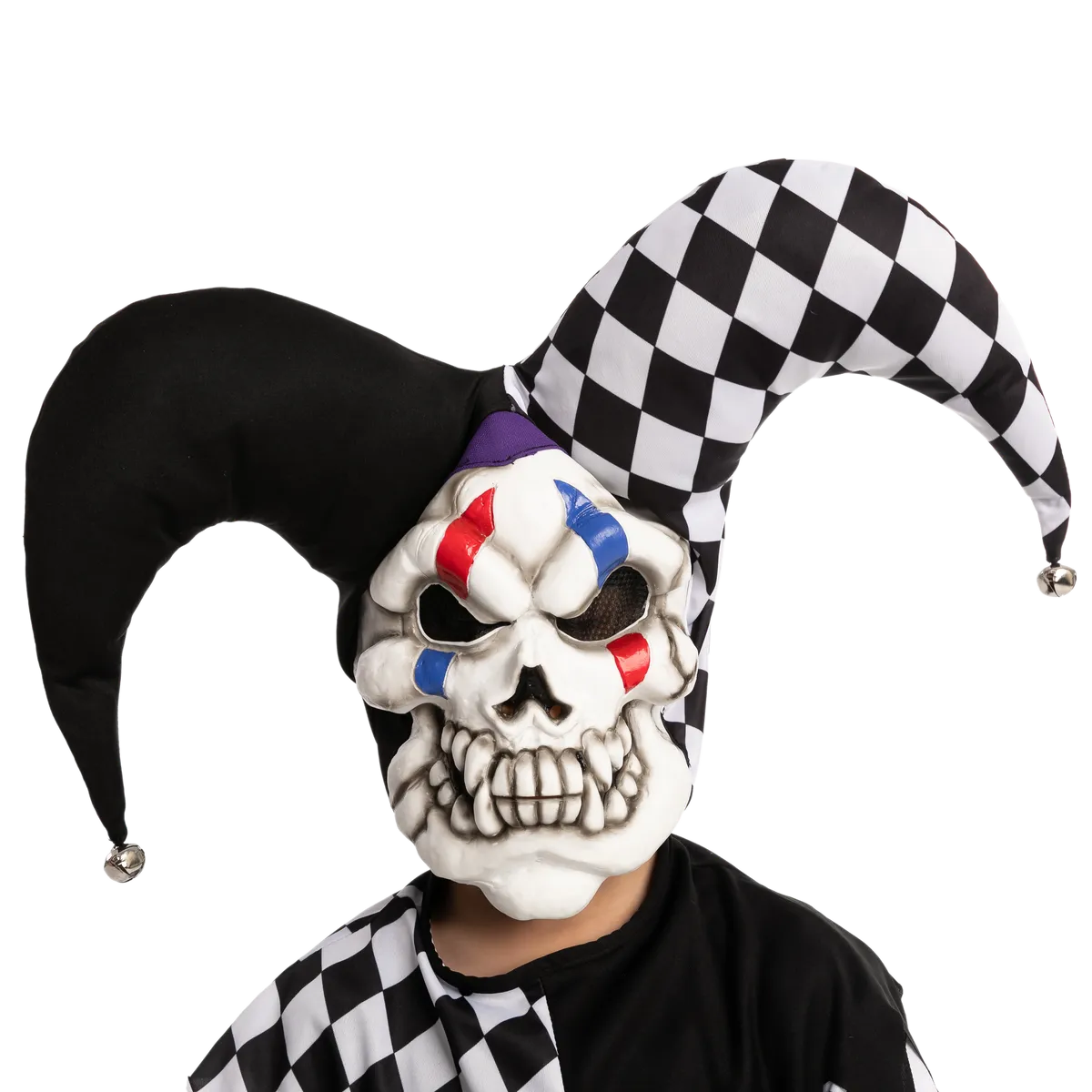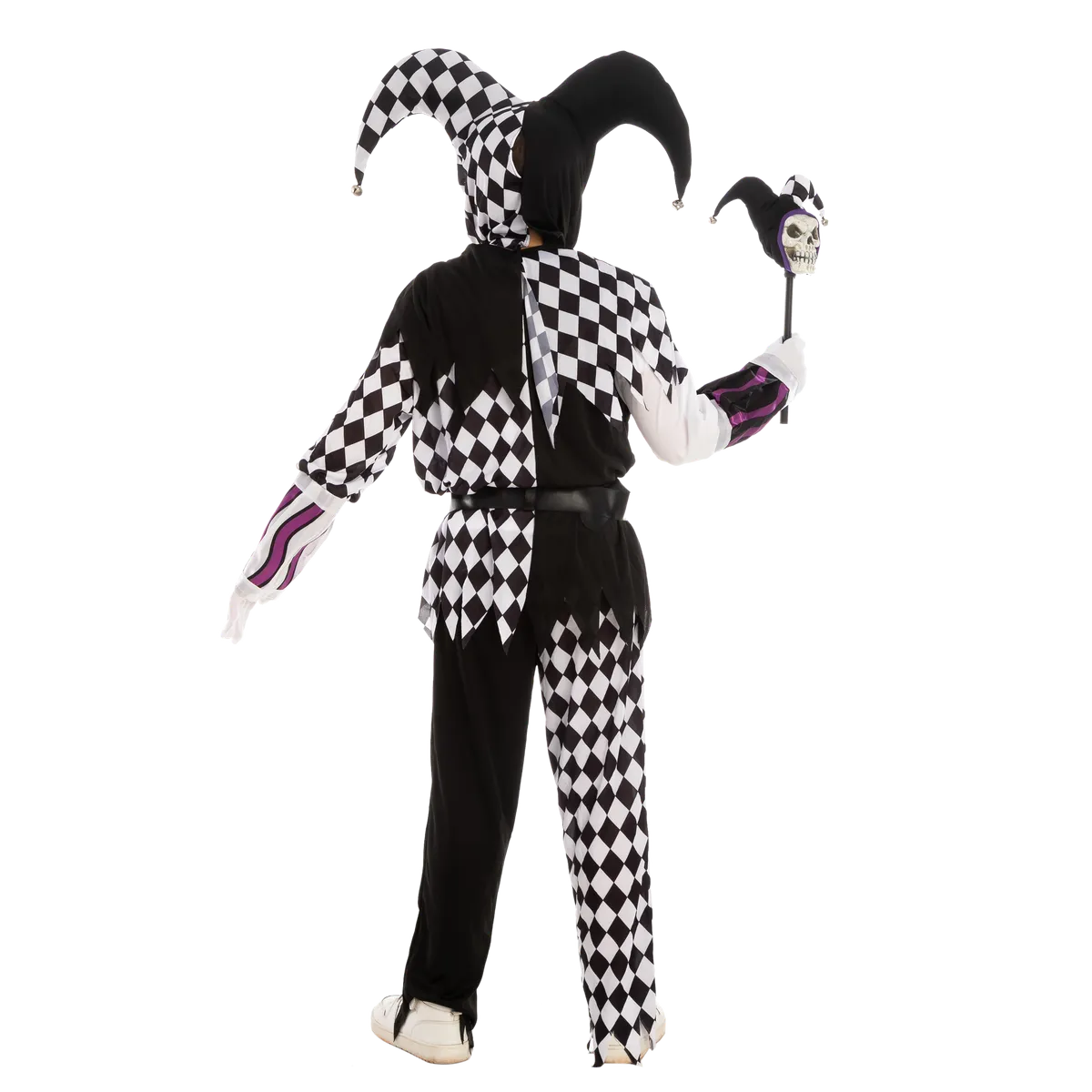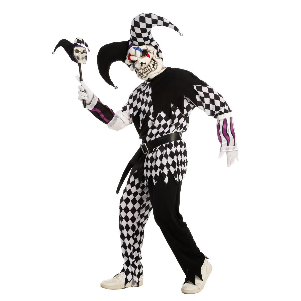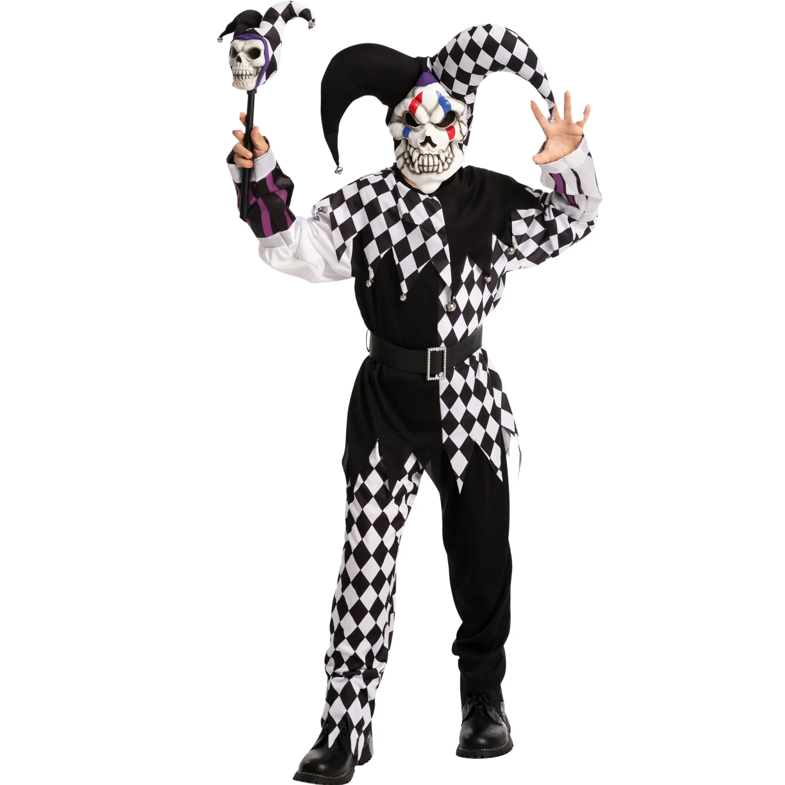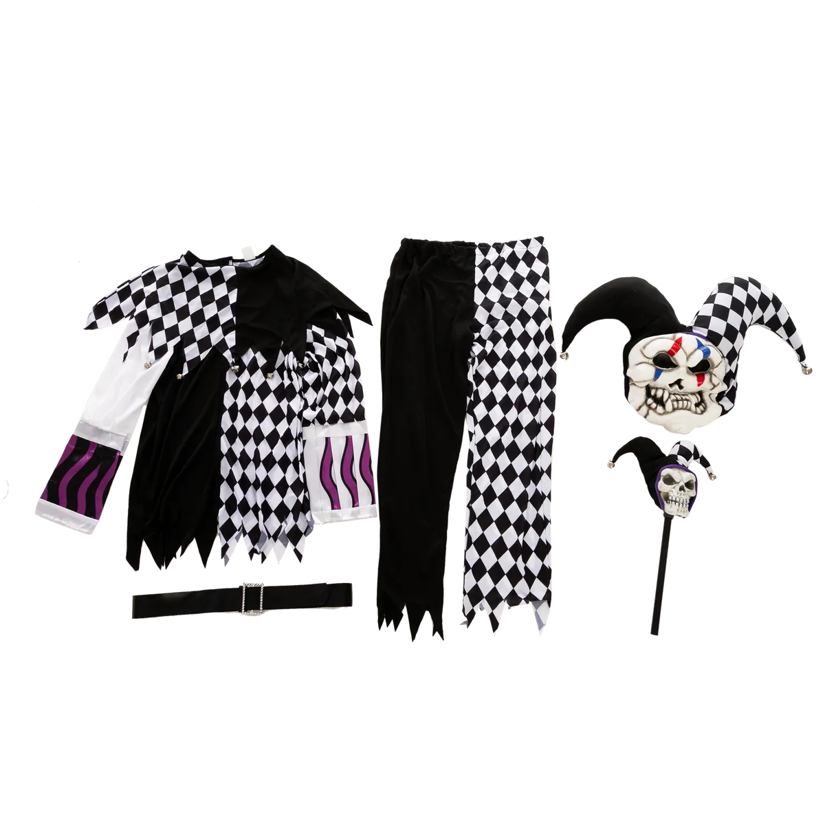 β’ This Evil Clown Costume Set includes a full head mask, jumpsuit, and psycho cane that will complete your scary Halloween look.