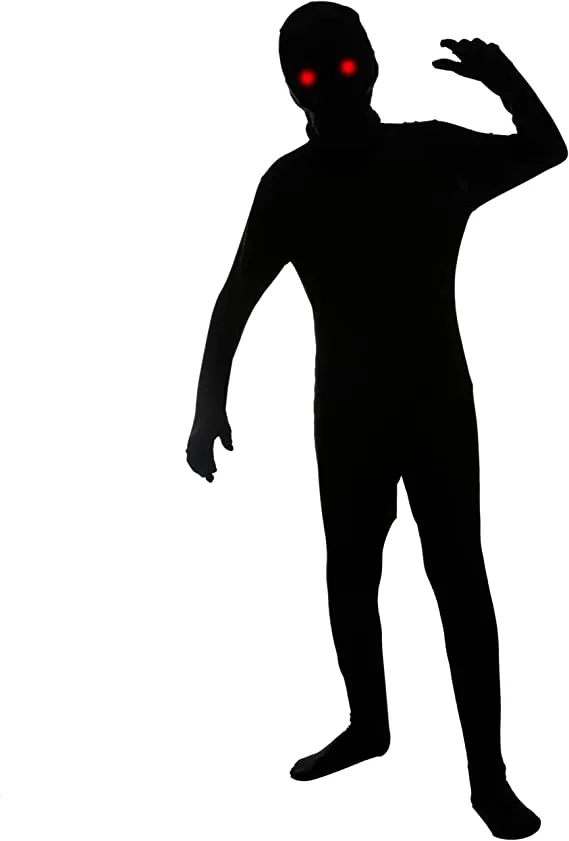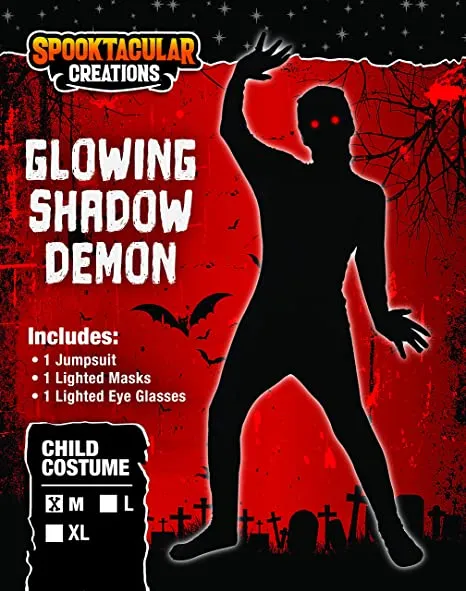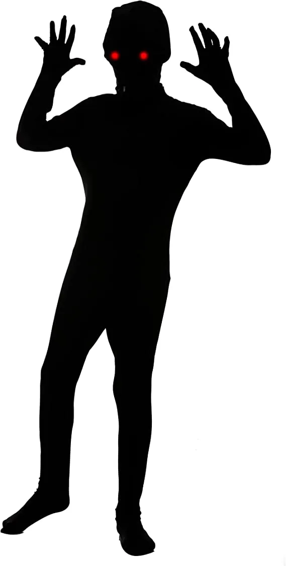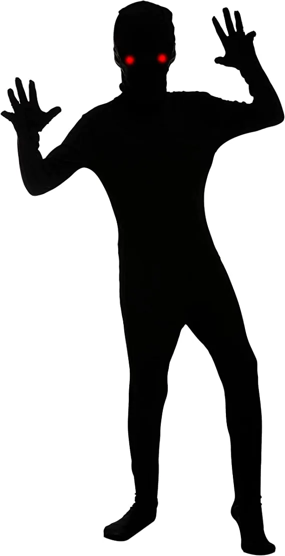 β’ Demon Child Halloween Costume includes a Full Black Second Skin Invisible One Jumpsuit with 1 lighted mask and 1 Lighted eyeglass.