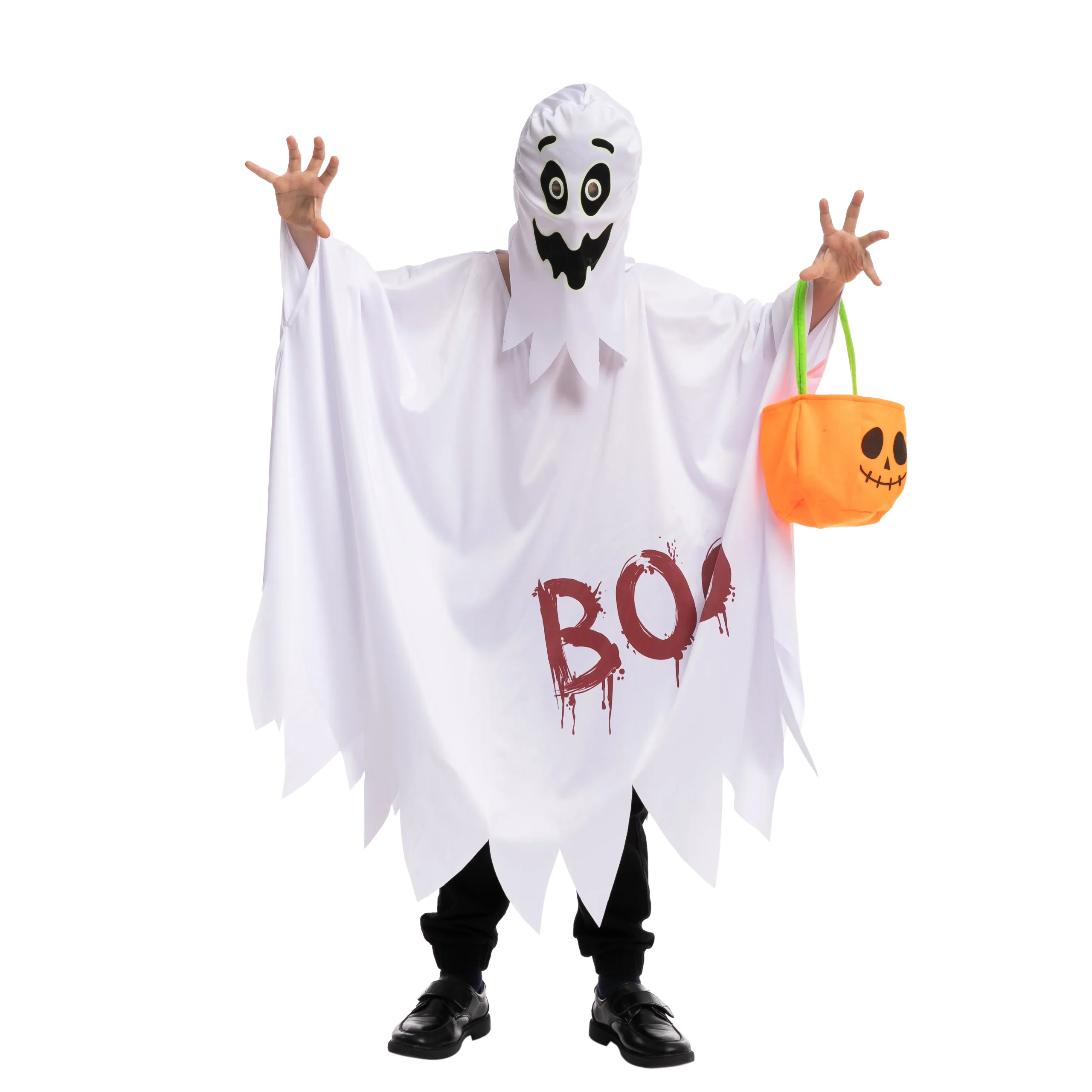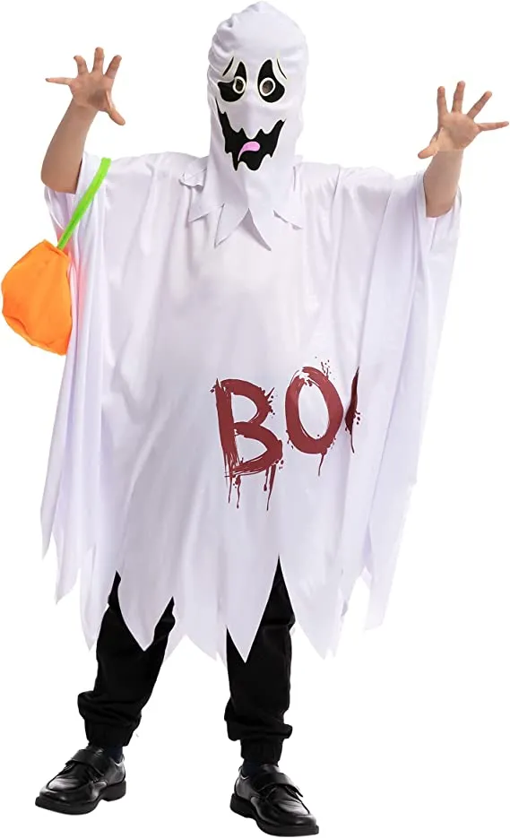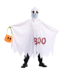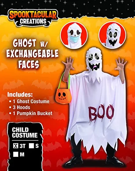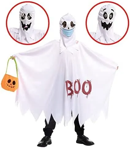 Our kids ghost costume set comes with a 3pcs unisex ghost costume with an exchangeable scary face with a creepy design. Three spooky designs are available for the interchangeable scary face. may quickly modify the visage to suit your mood. One ghost outfit, three hoods, and a pumpkin bucket are included. Your child will look great in a ghost Halloween costume this year. sturdy and expertly crafted. Fully synthetic polyester.