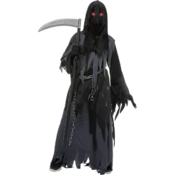 β’ Grim Reaper Halloween Costume for kids Includes 1 Dress, 1 cape with hood, 1 Metal chain, 1 pair of black gloves, 1 Face Mask, 1 toy sickle, 1 Pair of lighted eyes