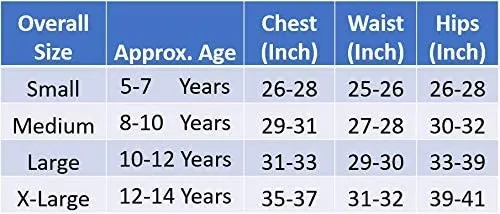 • Size: Small (5- 7 yrs), Medium ( 8- 10 yrs), Large ( 10- 12 yrs) and X-Large ( 12- 14 yrs)