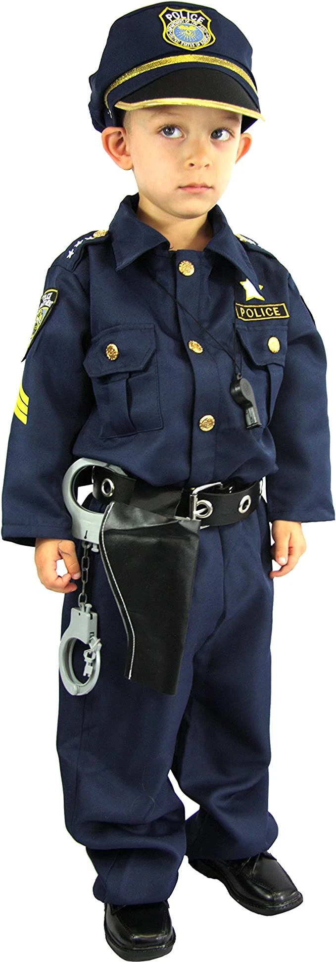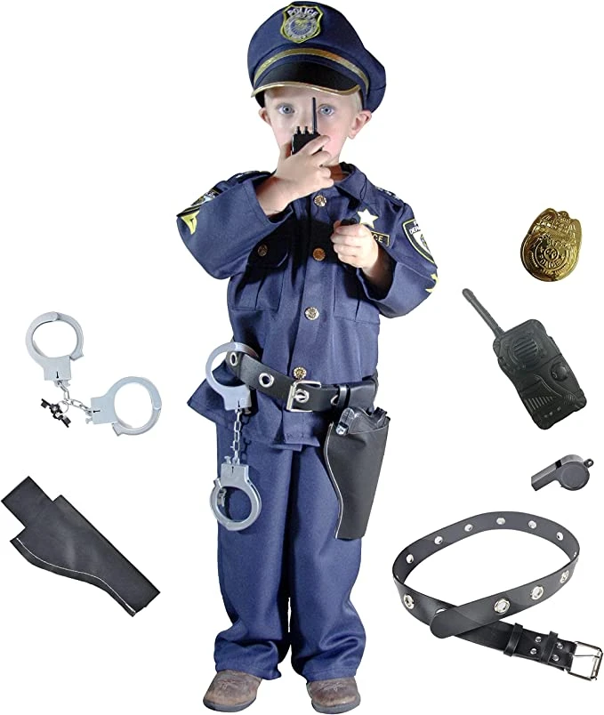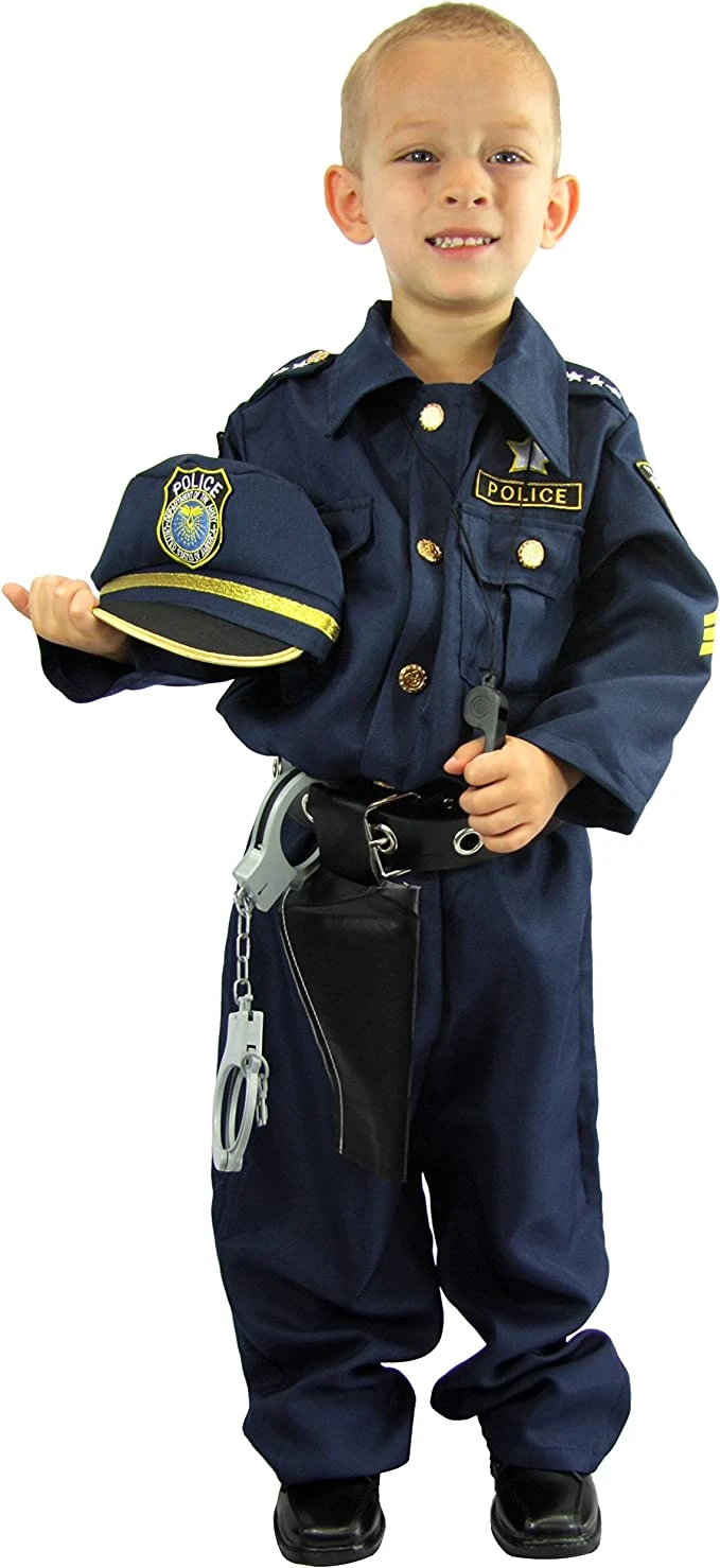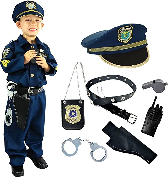 • Kids Police Officer Costume Includes Shirt, Pants, Hat, Belt, Walkie-Talkie, Handcuffs, Whistle, Gun Holster, Police Badge.