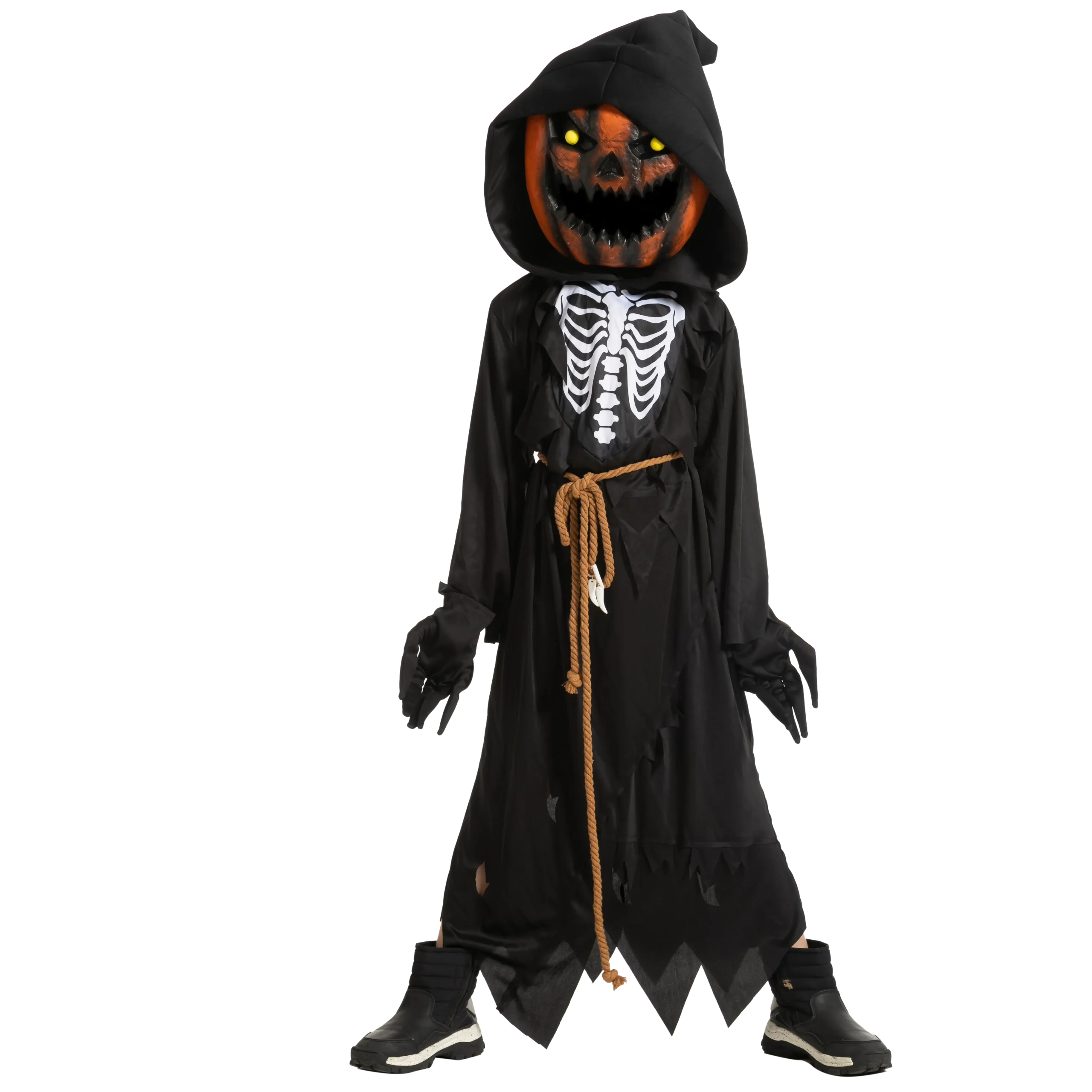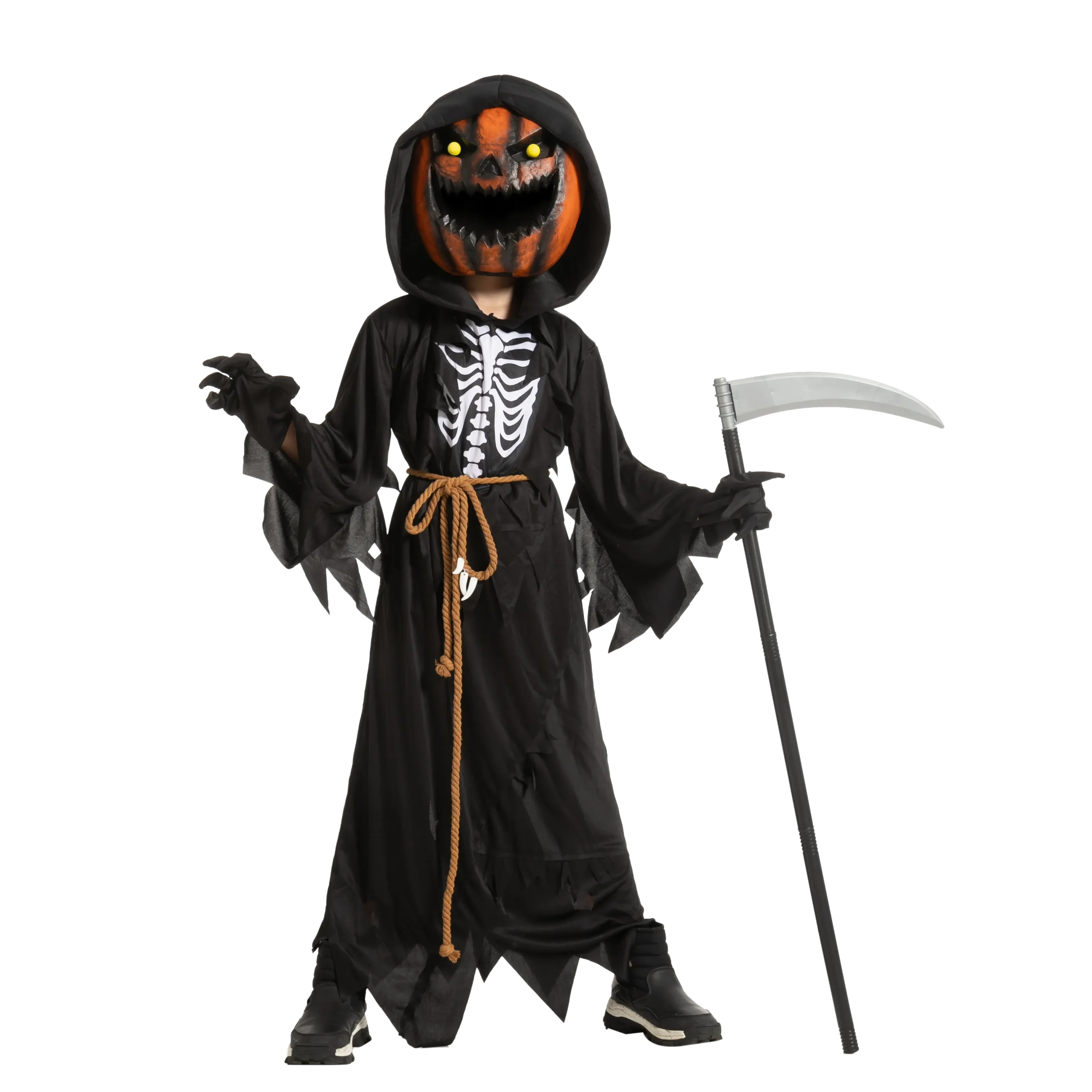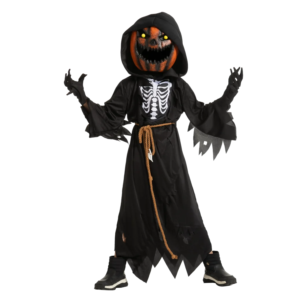 The reaper pumpkin costume is the ideal Halloween outfit for boys. Your child will appear really spooky and unsettling, just like a real scarecrow! An evil pumpkin mask, a patchwork dress robe with an attached rope belt, scarecrow gloves, and a hooded robe with a rope collar make up the outfit. This outfit was made entirely of polyester. The mask includes a hat and gloves and is held in place by elastic straps. To complete your scarecrow image, wear makeup. The face mask that comes with it has a menacing grin and sharp fangs, giving your kid a genuinely dreadful appearance!