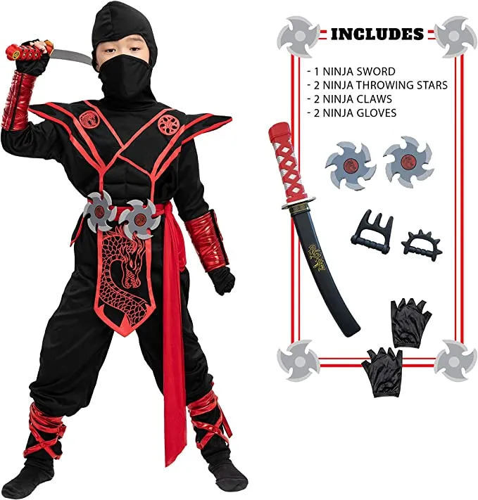 These dragon costumes with attached hood, face mask, belt, 2 pcs ninja gloves, and other foam accessories and other accessories made of foam will be staying out of sight on Halloween night. Allow your child to dress up as a ninja for Halloween and take to the streets as a sneaky character! When he dresses in a mysterious boysβ ninja costume that is sure to impress everyone in the neighborhood, heβll be ready for any crime-fighting that comes his way! Gear up, little guy! Not much is known about the origins of the Ninjas aside from that they were usually recruited from humble beginnings. Ninjas have also been known to disguise themselves and enter enemy camps in order to collect information or carry out assassinations.