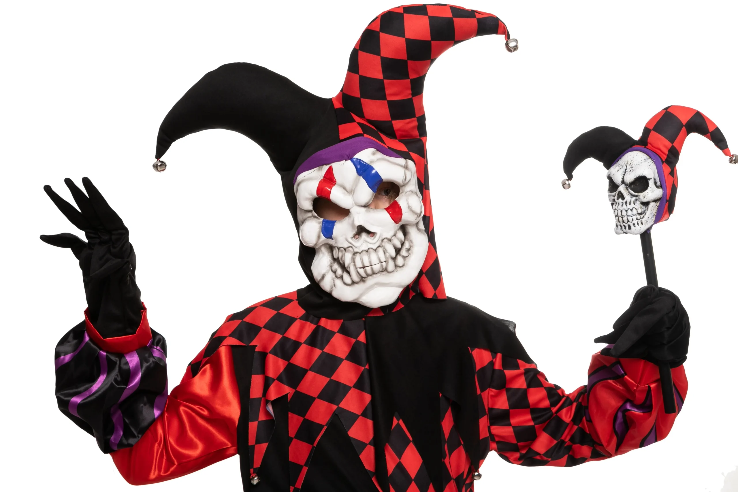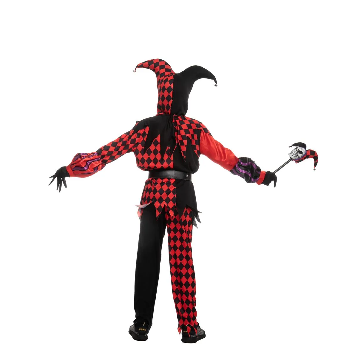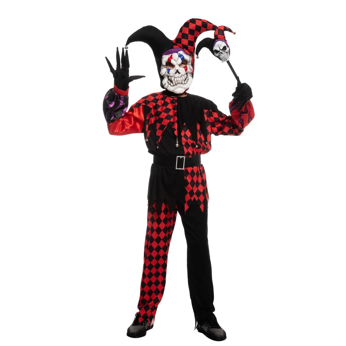 β’ Red Evil Jester Costume includes a full head mask, psycho cane, waist tie, hood, and mask. Great childrenβs clown costume.