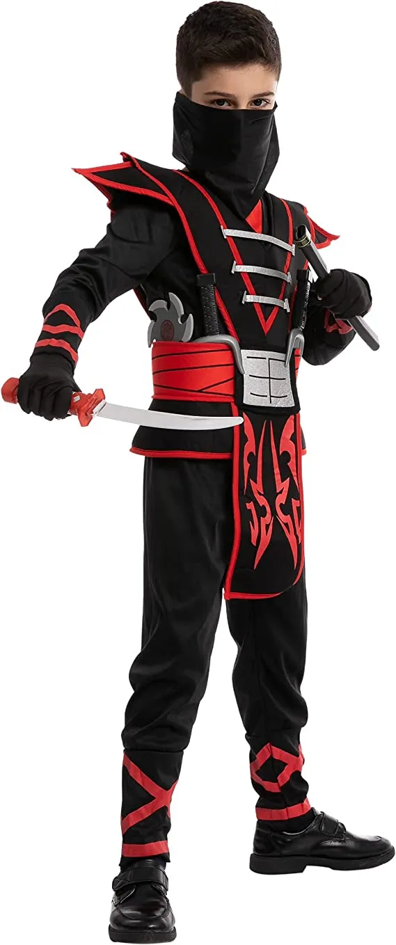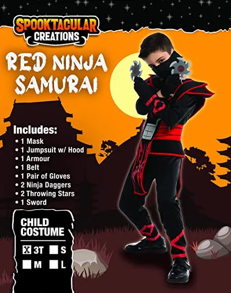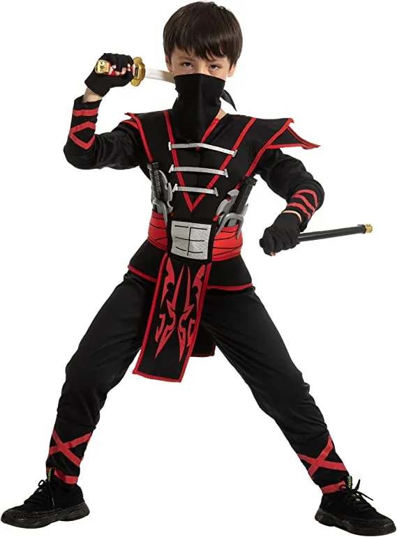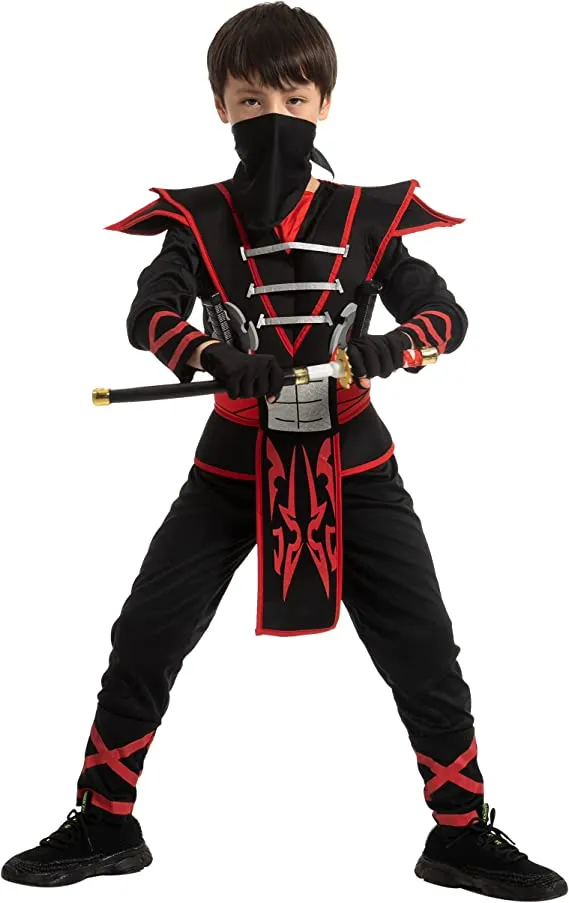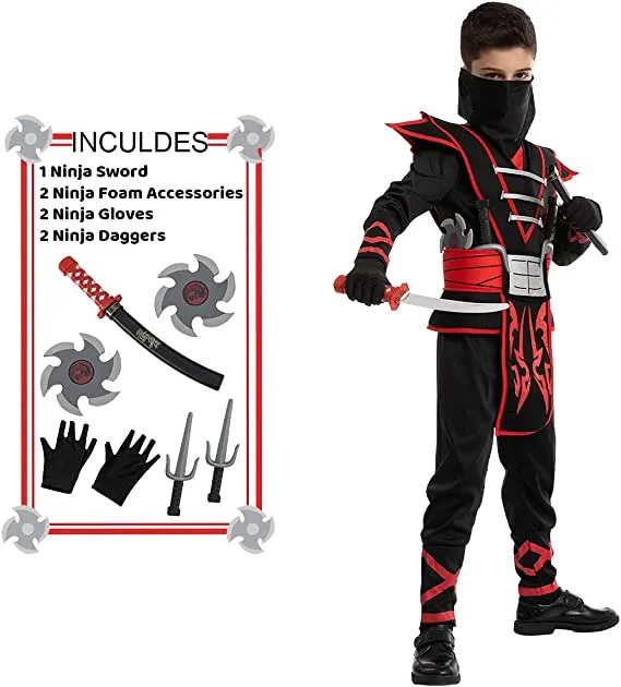 Make your childβs dream of becoming a true ninja a reality! The strength of a brave ninja is unleashed by our red ninja costume for boys, It allows them to steal the scene and zip zap their way at your Halloween costume party! The costume set includes a red and black ninja jumpsuit with an attached hood, a mask, a ninjaβs body armor (chest and shoulders have foam armor), a belt, ninja gloves, 2 ninja daggers, and other foam accessories.
